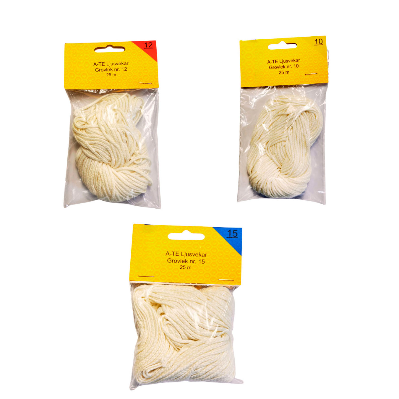 För stöpta ljus i normal grovlek t ex antikljus och motsvarande samt gjutna med liten diameter. Nr 12 För gjutna ljus med normal diameter och stöpta med stor diameter. Nr 15 För stöpta ljus med extra stor diameter t ex blockljus samt gjutna med stor diameter och rullade vaxkakor.