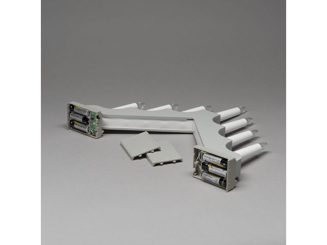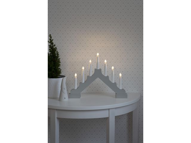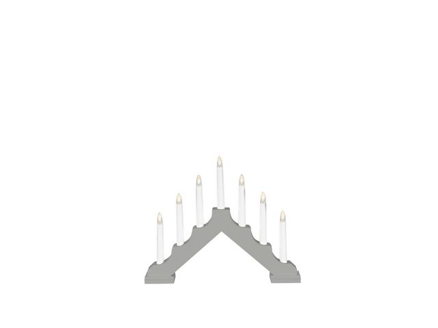 Klassisk 7-armad elljusstake i trä med varmvita LED-lampor. Lackad i matt grå färg. Ljusstaken lämpar sig bra till platser där eluttag är svårtåtkomliga då den drivs med 6 st AA-batterier och har en timer på 6 timmar. Ljuskällorna är inte utbytbara. Höjd 28 cm och bredd 38 cm.