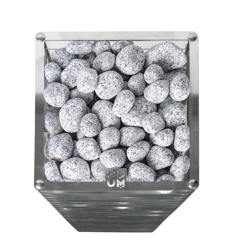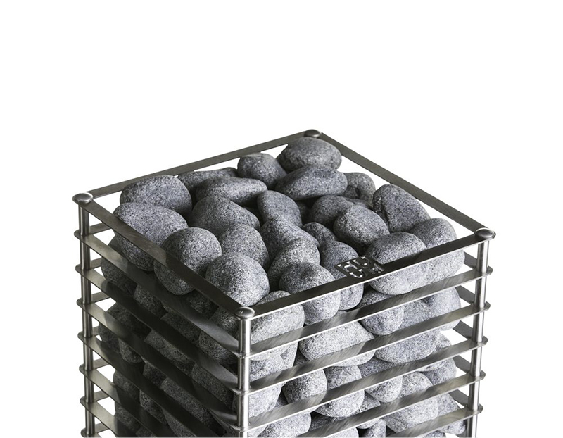 I bastuaggregat av HUUM används minimalt med metall för att allt värme skulle komma från stenarna och så lite värme som möjligt från metall.