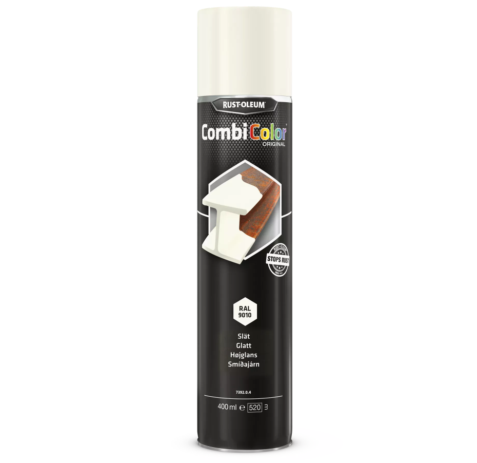Rust-Oleum Combicolor Aerosol Original 400ml är ett enstegs aerosolsystem för metallskydd med primer och täckfärg i ett. Kan appliceras direkt på rost, naket metall eller med CombiPrimer Anti-Corrosion 3369/3380 för primade ytor. Lämplig för mindre underhållsjobb eller touch-ups i lätt industriella miljöer med normal luftfuktighet och inomhusapplikationer. Produkten är baserad på urethanmodifierad alkyd, fri från bly och kromat, innehåller rostskyddande pigment och ger en högblank, hållbar finish med god täckförmåga.