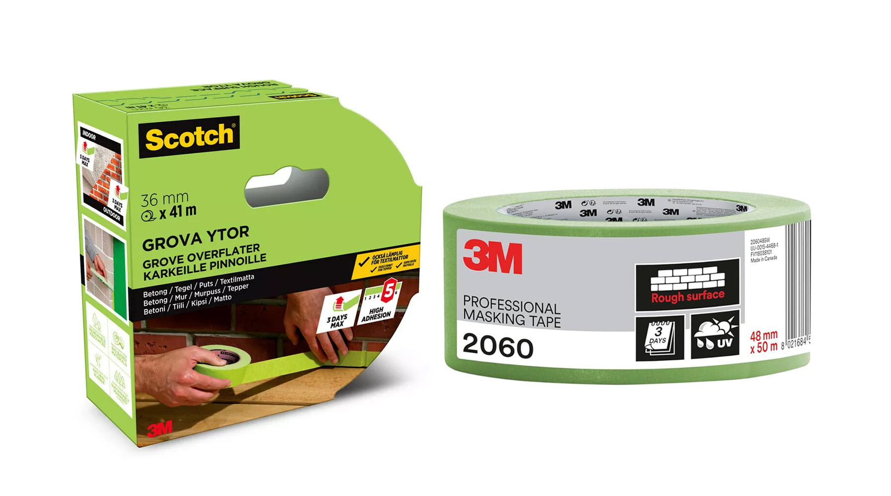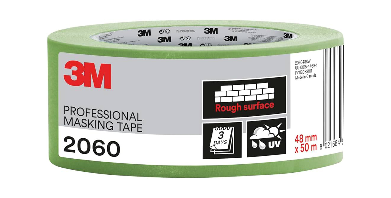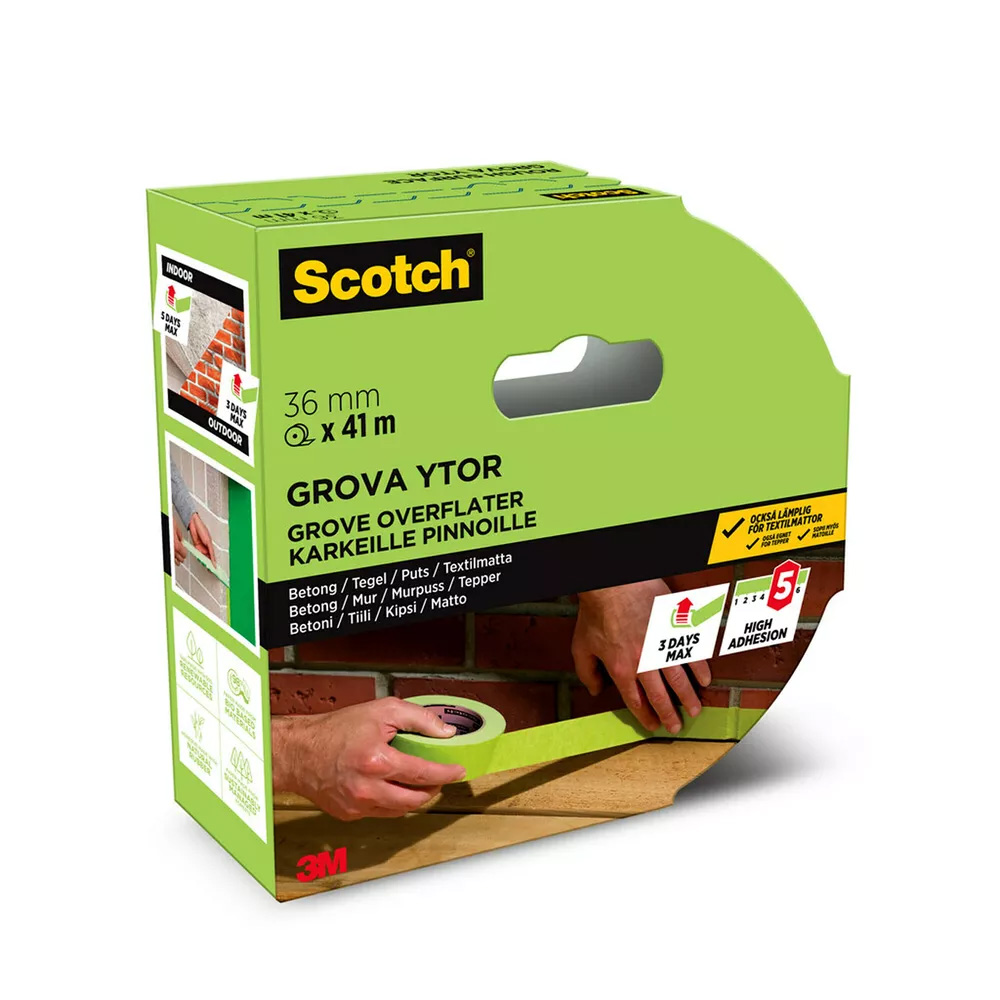 Maskeringstejp för ojämna ytor som sitter säkert på ojämna ytor, utan att lämna häftämnesrester om den tas bort inom 5 dagar inomhus/3 dagar utomhus efter applicering. Denna tejp passar perfekt för tegel, betong, stuckaturer, puts och ohyvlat trä samt lack och till och med mattor. Den är lätt att riva av för hand och kan användas både inomhus och utomhus.
