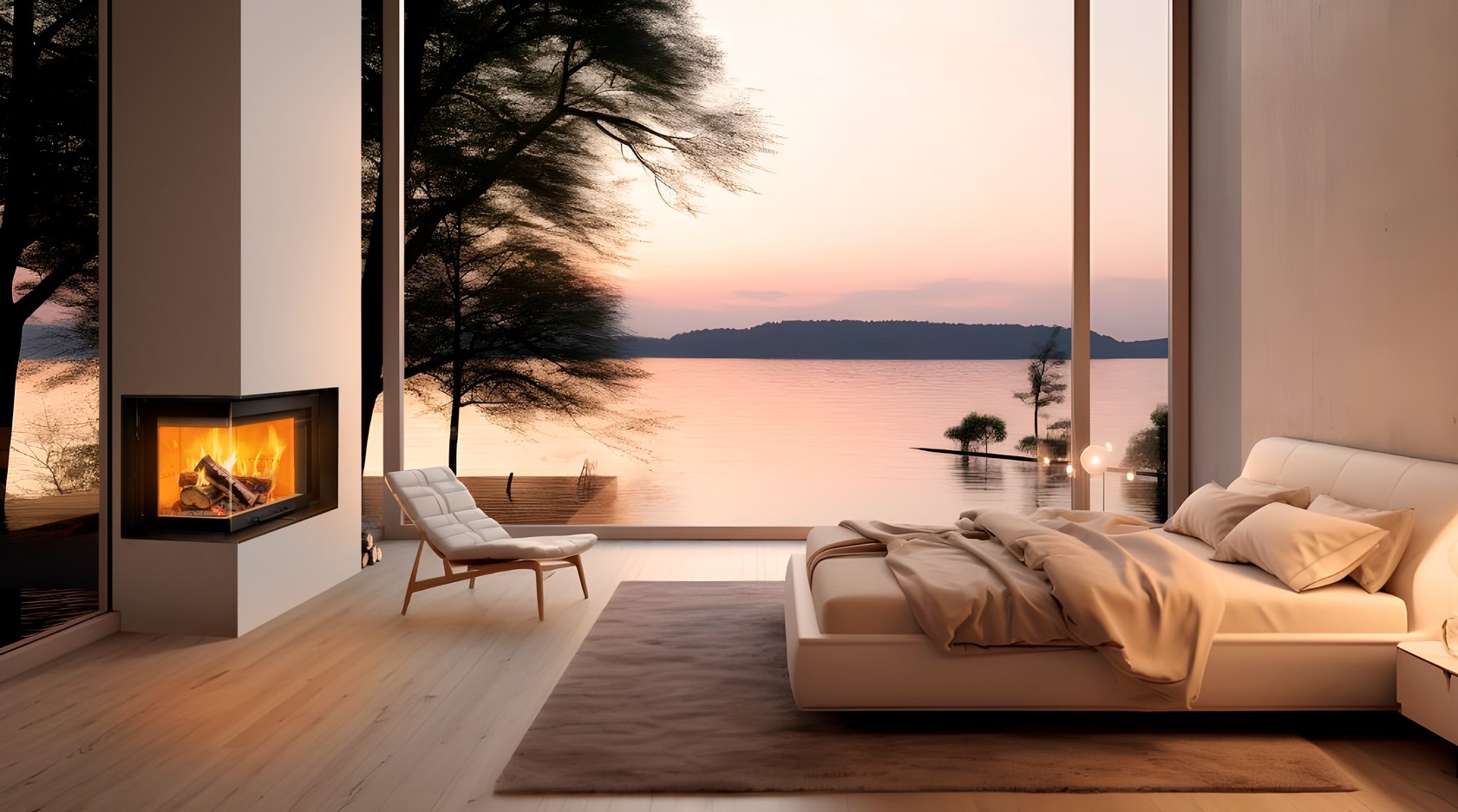 IZARO, en hörnkamin med en giljotindörr tillverkad av ett enda stycke rundat vinklat glas så att du kan njuta av eldens hypnotiska kraft. Du väljer själv vilken av de två sidorna du vill njuta av.