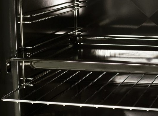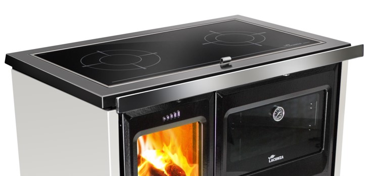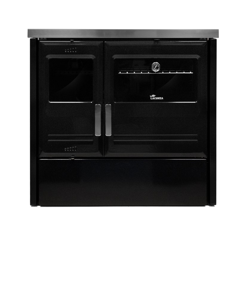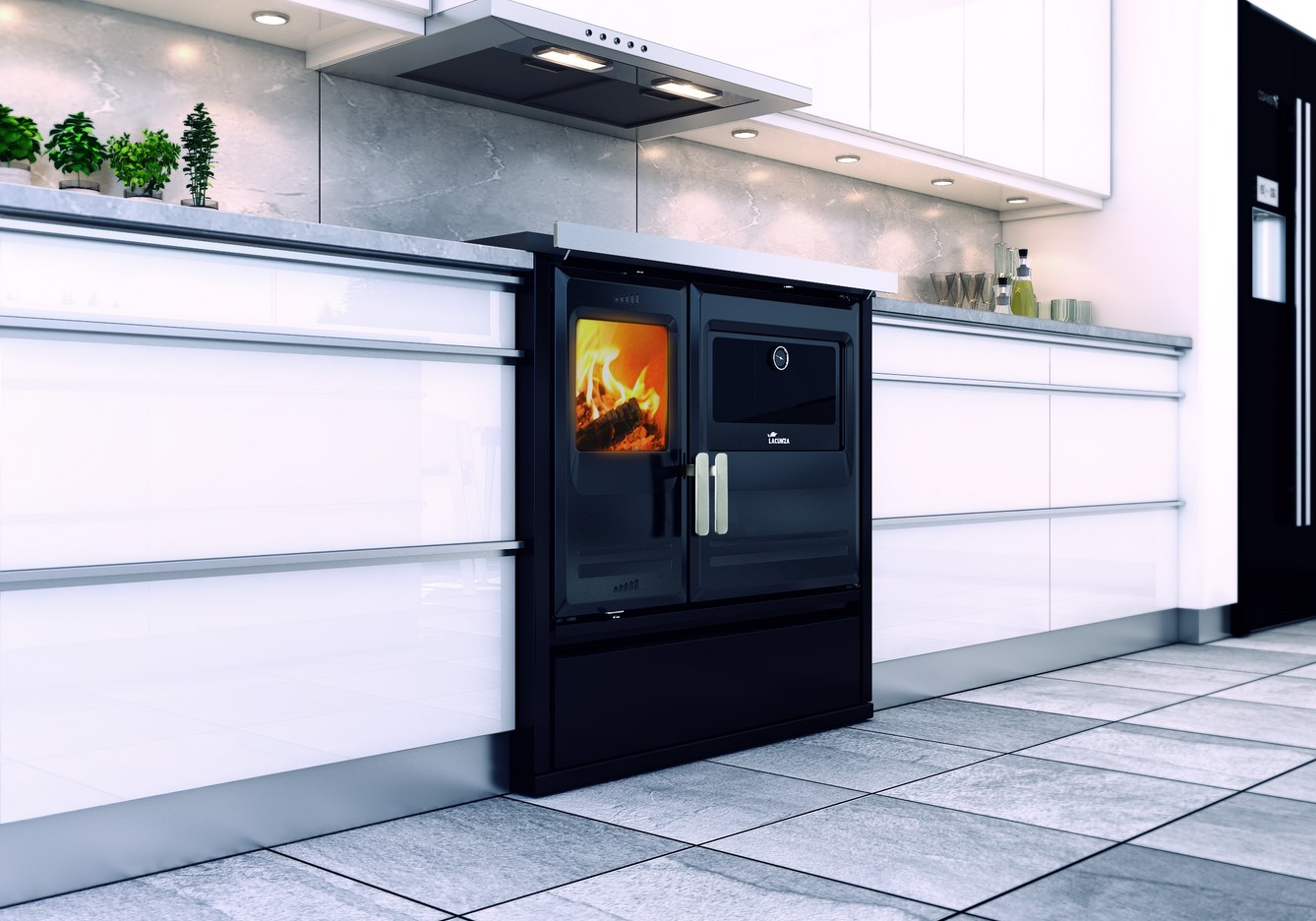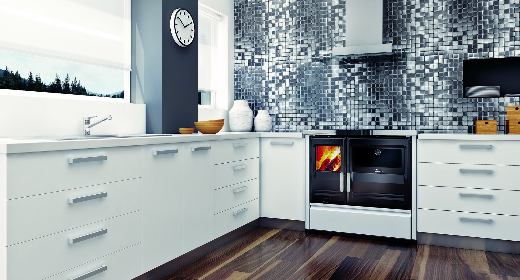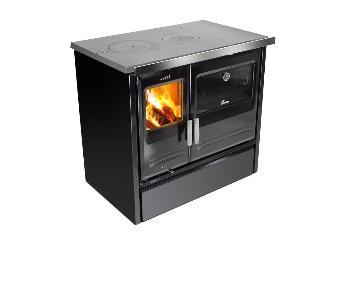 Vedeldad köksspis med yta i högkvalitativ emalj. Kan rengöras med bara en fuktig trasa.