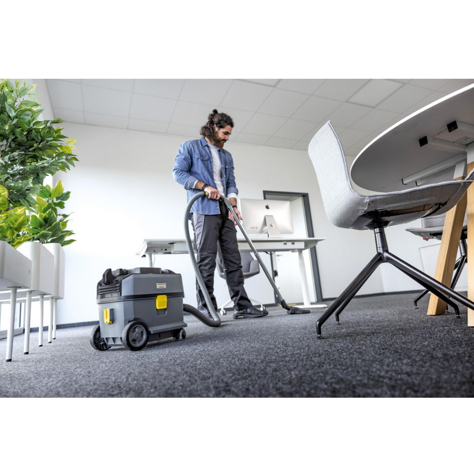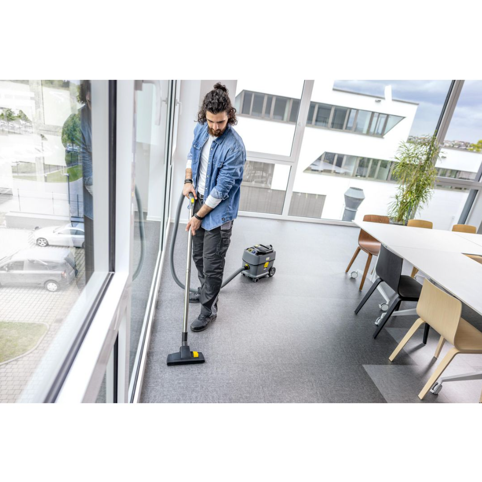 T 10/1 Bp är en kraftfull och tyst batteridriven torrdammsugare som är idealisk för professionell användning inom hotell, restaurang, detaljhandel och städbranschen. Med en ljudnivå på endast 57 dB(A) passar den perfekt i bullerkänsliga miljöer. Maskinen är tillverkad av 45 % återvunnet material och kombinerar hållbarhet med hög prestanda och utmärkt rengöringsresultat. Den kompakta och ergonomiska designen gör den enkel att transportera och använda i dagligt arbete. Batteri och laddare beställs separat.