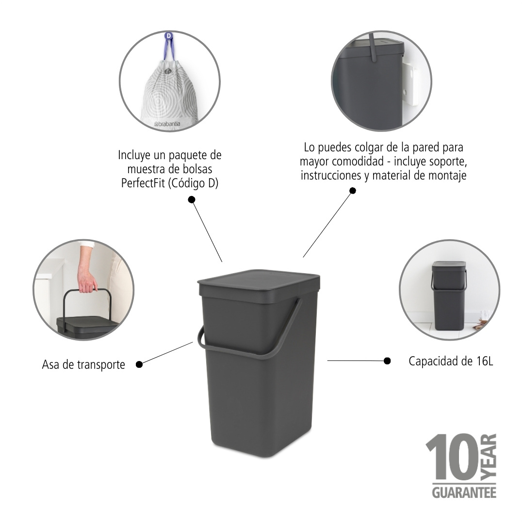 Sorterar du tomma förpackningar, flaskor eller burkar separat? Gör det lätt för dig själv, organisera allt med denna 16 liters Sort & Go Avfallshink från Brabantia. Placera den i valfritt hörn, tätt mot väggen, eller spara ännu mer golvyta och häng upp den med det medföljande väggfästet. Dags att tömma den? Det är lätt som en plätt tack vare det stora handtaget och greppet i botten för att enkelt kunna bäras och tömmas. Sortera och gå!