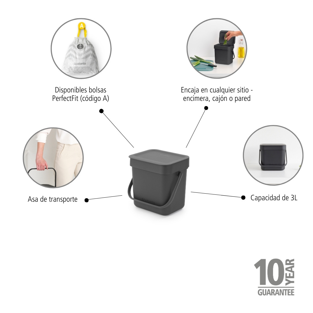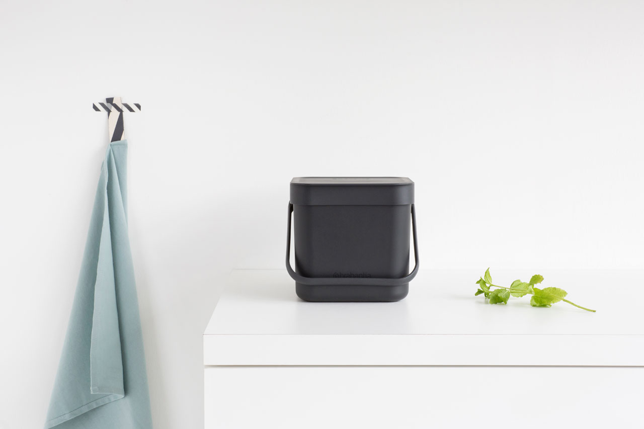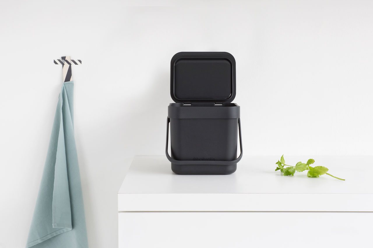 Denna söta 3 liters Sort & Go avfallshink från Brabantia, har ett lock som kan lämnas öppet, är perfekt för skal, smulor, matrester... allt organiskt köksavfall faktiskt. Placera den bara på köksbänken eller göm den i en låda. Full? Ta tag i det praktiska handtaget och töm den på din komposthög eller i din organiska avfallsbehållare. En underbar avfallshink i XXS-storlek!