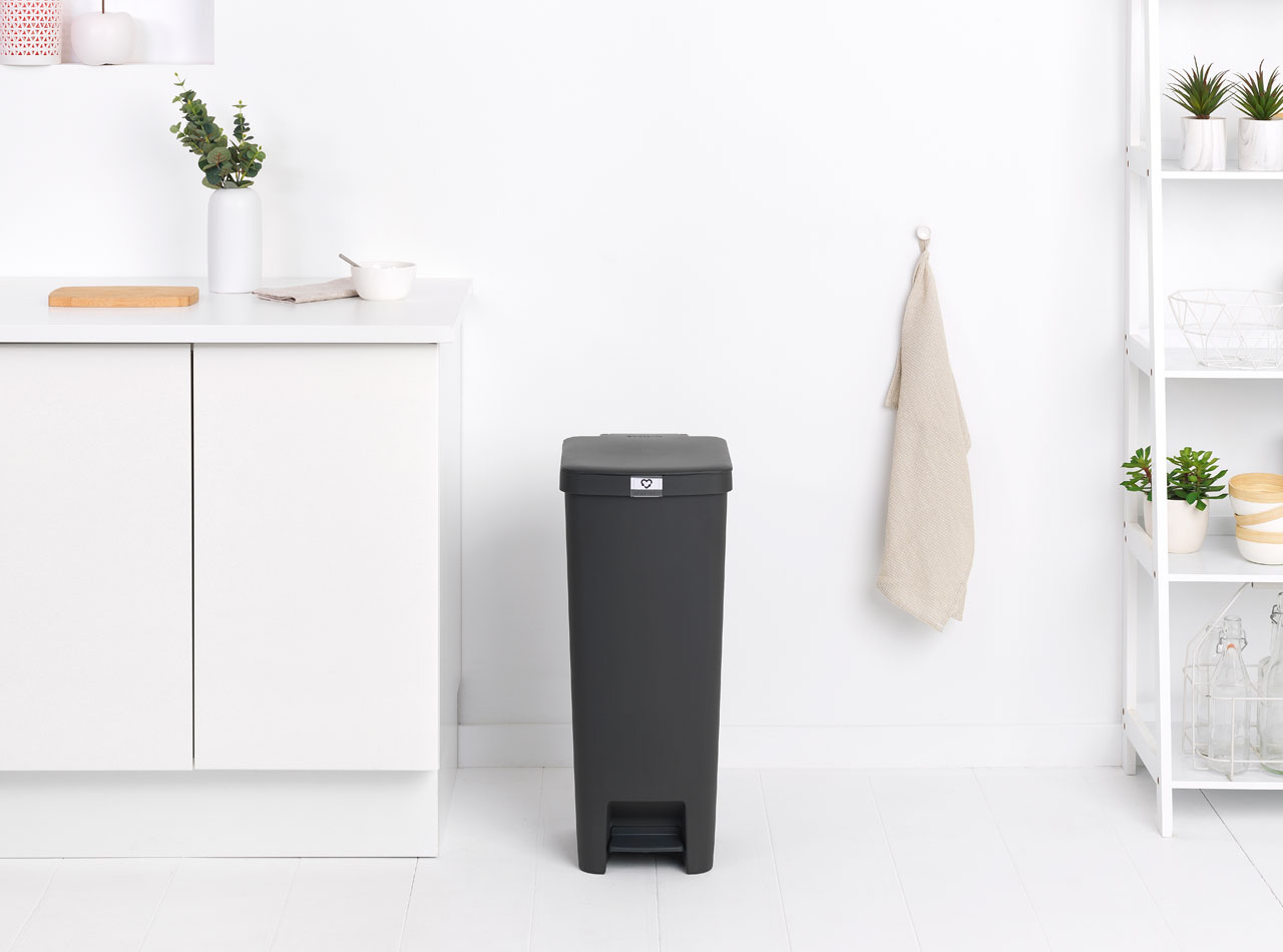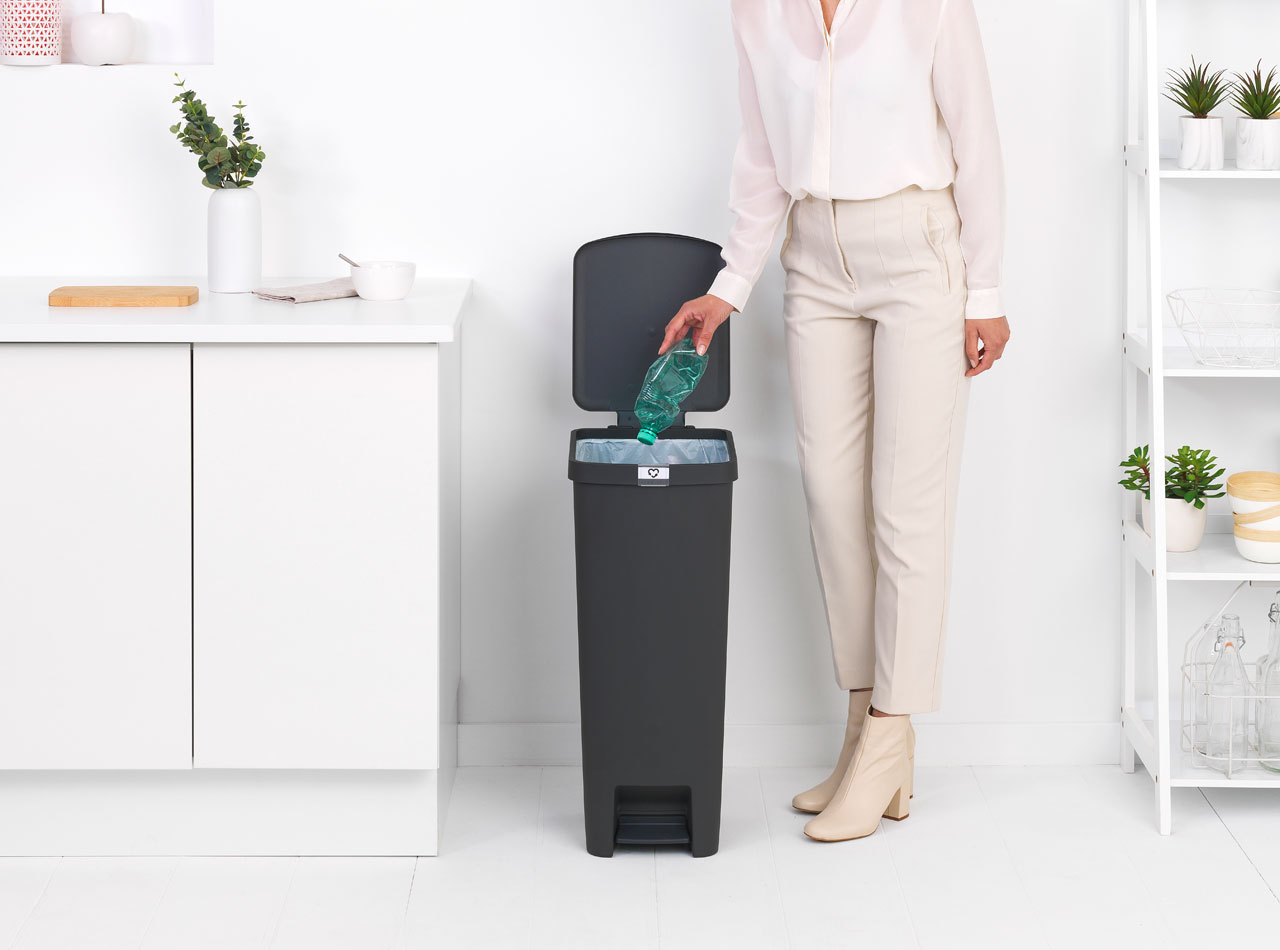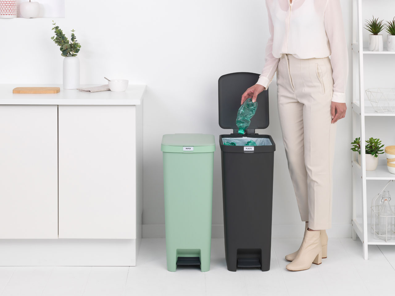 Steppa upp din återvinning med Brabantias StepUp pedalhink 40L! Tillverkad av 91% återvunnet avfall och för återvinning av avfall. Med en klicketiketthållare för dina egna avfallsetiketter och en praktisk påsförvaring inuti. Om du älskar återvinning kommer du att älska den här pedalhinken.