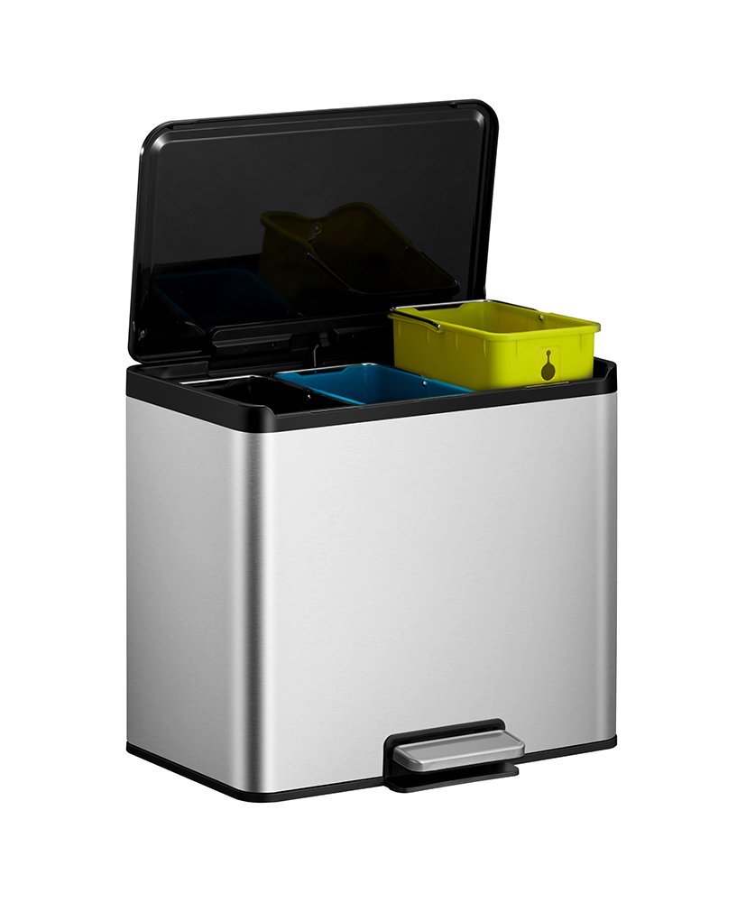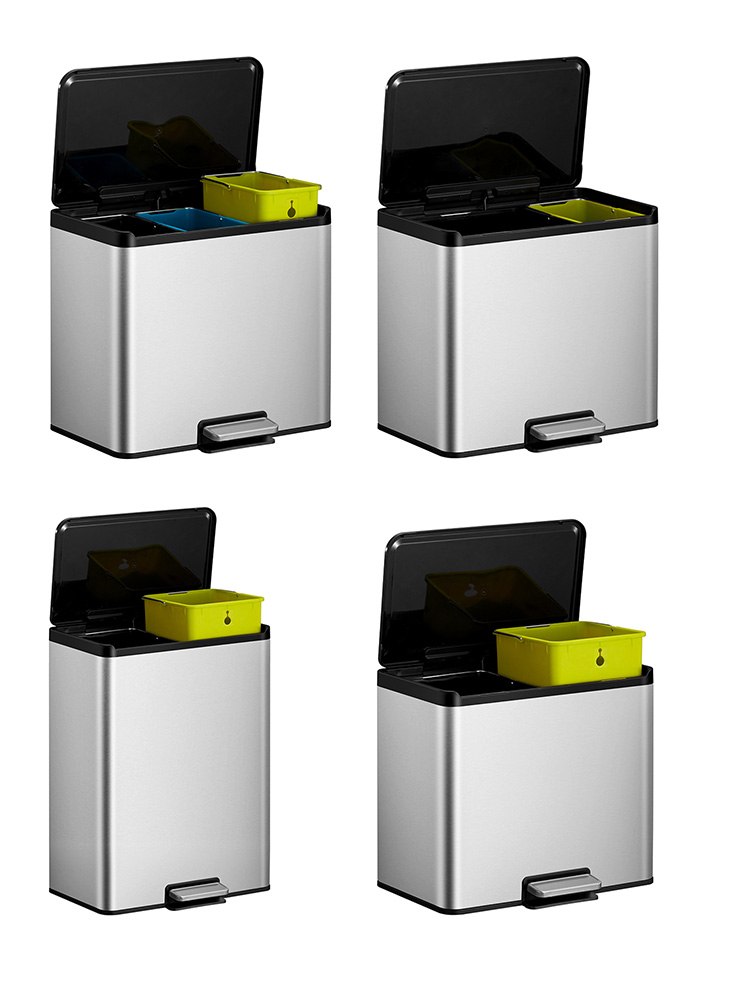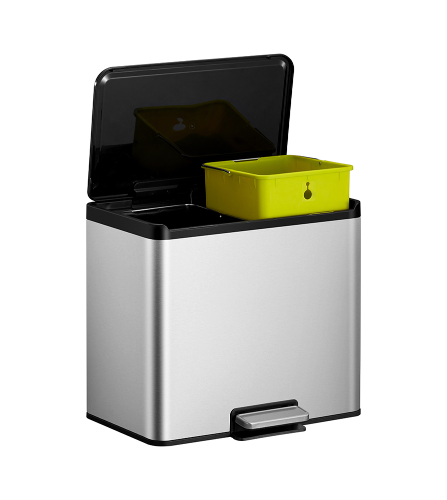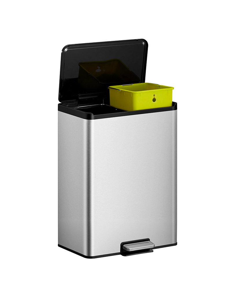 Rektangulärt pedalkärl för smidig avfallssortering med anti-fingeravtryck, separata innerkärl och mjuktstängande lock. Borstat rostfritt stål.