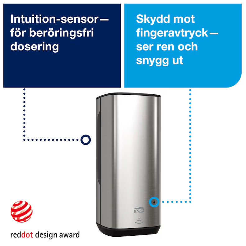 En modern design, Image Design Line, med släta ytor och rena linjer som passar sömlöst var som helst. Skapa ett bra intryck som förstärker den högkvalitativa bilden av din anläggning. Snyggt rostfritt stål med anti-fingeravtrycksbeläggning ser bra ut och förblir rent. Dess beröringsfria utmatning säkerställer god handhygien för alla användare. Kan användas med ett brett utbud av tvål, desinfektionsmedel och lotioner i förseglade flaskor från Tork. Den är Easy to use-certifierad och ger god handhygien för alla användare.