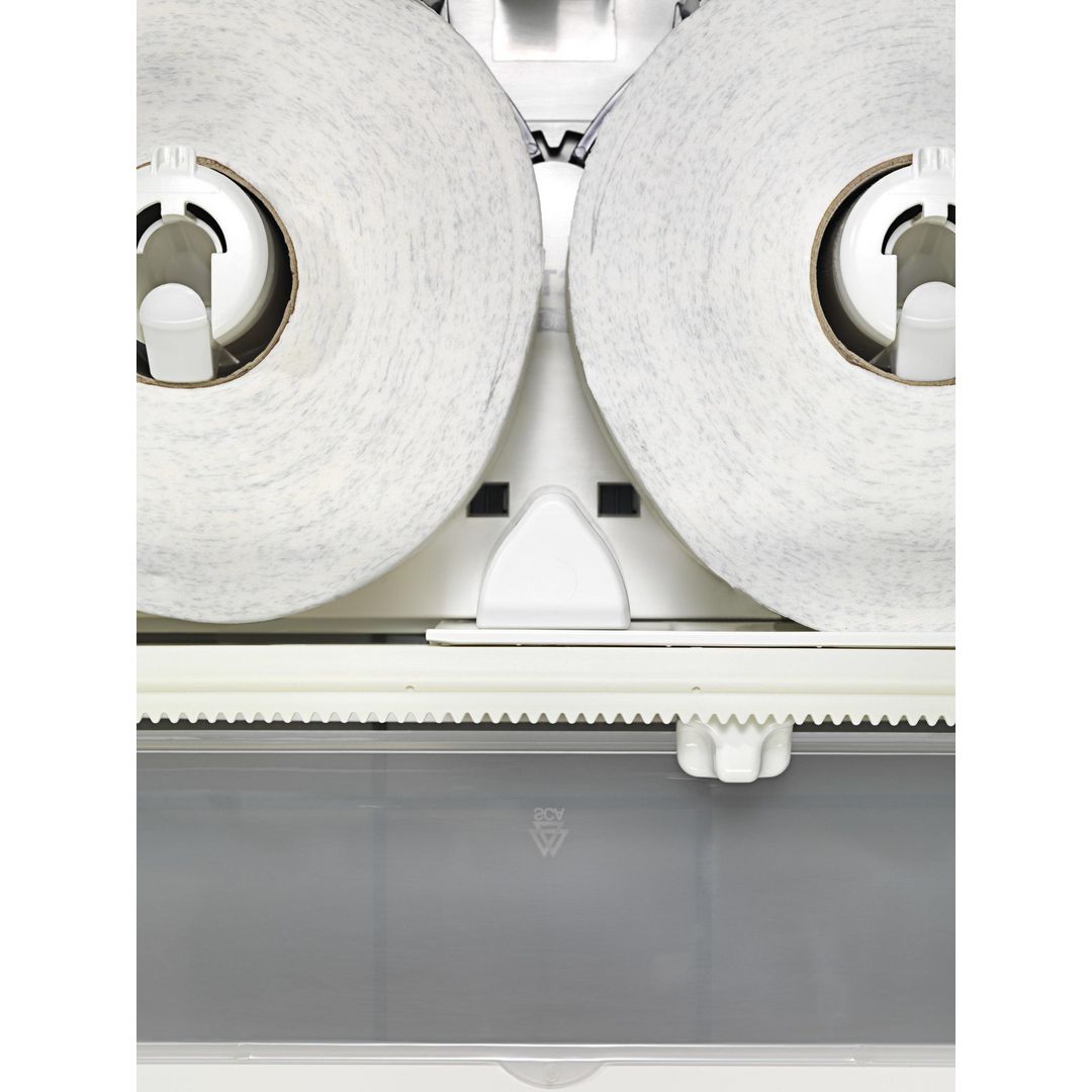● Tork Dispenser Mini Jumbo Twin Toalettpapper i Elevation-design är idealisk för högtrafikerade toaletter, minimerar avfall med smart rullhållare och optimal rullbroms, och har ett genomskinligt fönster för enkel påfyllning.