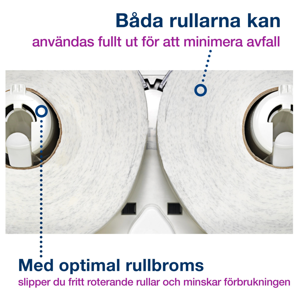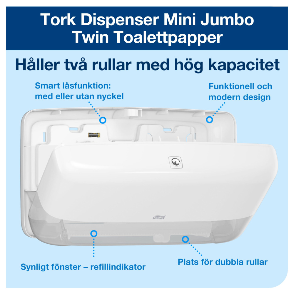 Håll nere driftkostnaderna med denna effektiva Tork Dispenser Mini Jumbo Twin Toalettpapper. I välbesökta utrymmen som kräver mycket toalettpapper kommer denna högkapacitetsdispenser med plats för två fulla rullar att göra gästerna nöjda. Båda rullarna kan användas fullt ut för minskat avfall. Den slutna dispensern skyddar rullarna för förbättrad hygien och kan fyllas på när som helst för att undvika pappersbrist. Med en funktionell, modern design lämnar den ett långvarigt, positivt intryck.