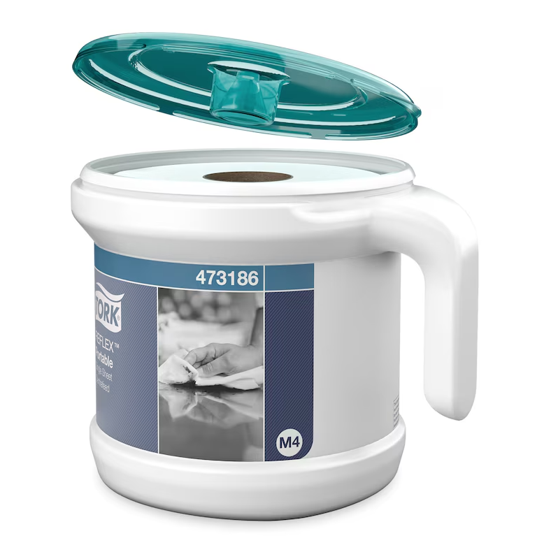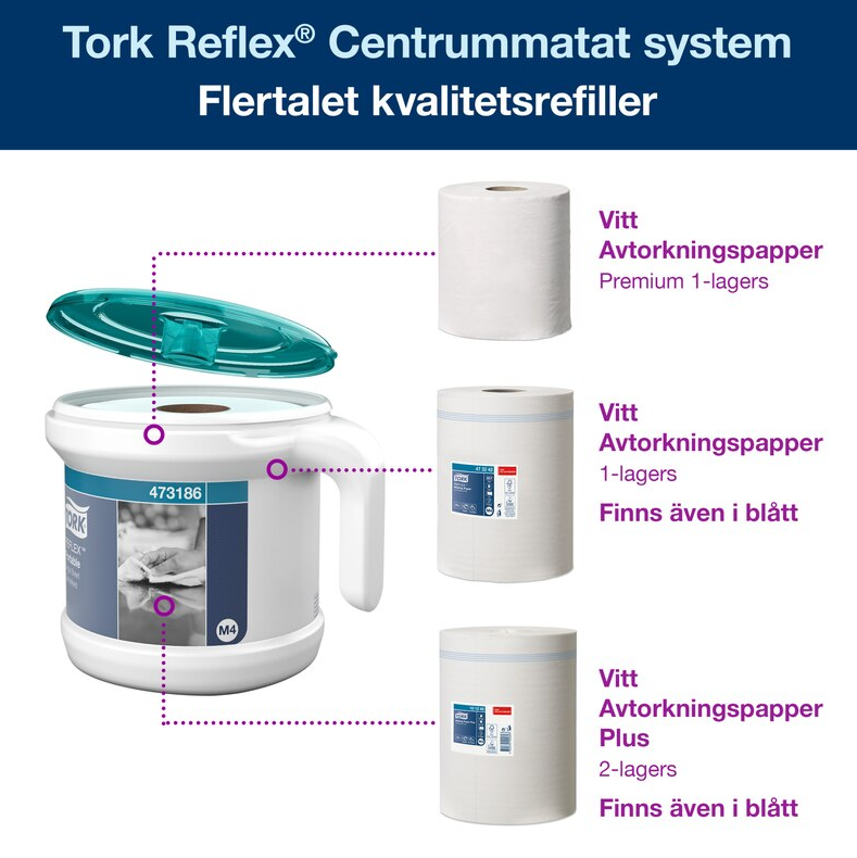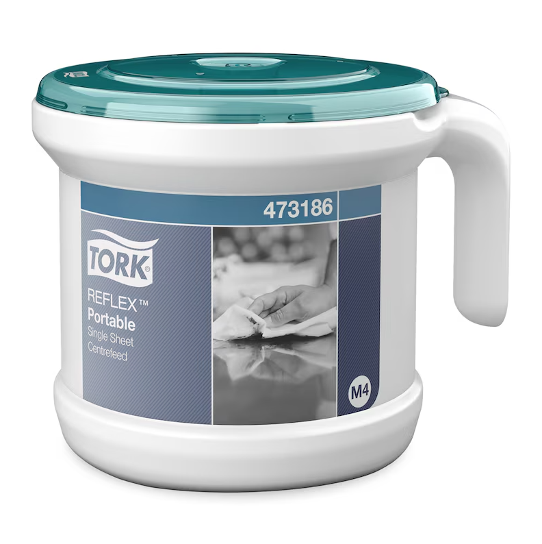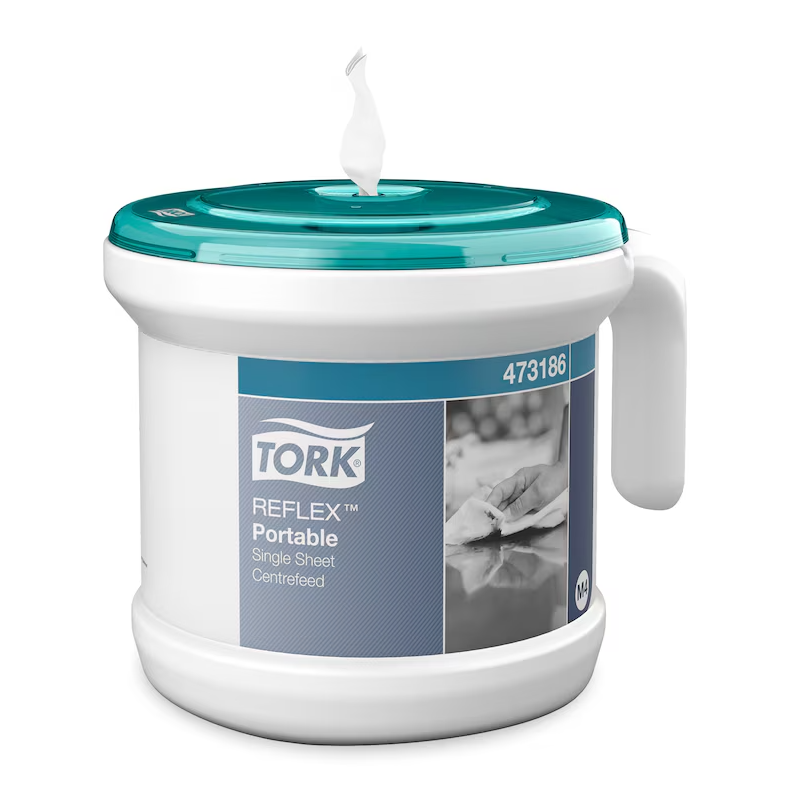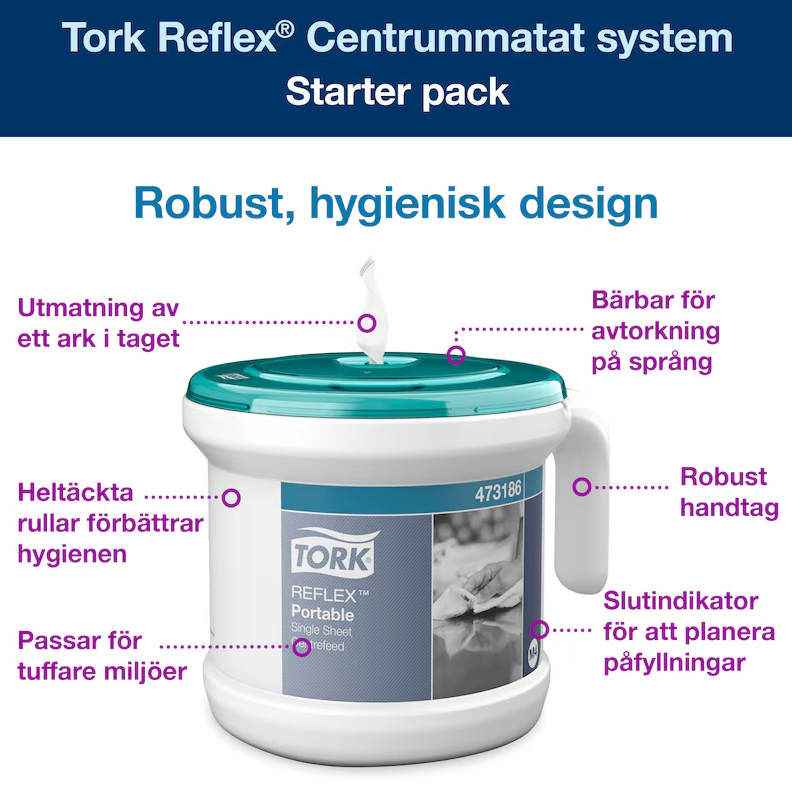 Det centrummatade systemet Tork® Reflex® med arkmatning är den ideala lösningen för hand- och ytavtorkning i mobila arbetsmiljöer. Detta lättanvända, hygieniska och slitstarka system minskar förbrukningen med upp till 37% jämfört med systemet Tork® Centrummatad. Det är idealiskt i hotell- och restaurangbranschen, för städföretag och i andra mobila miljöer. Det robusta handtaget gör dispensern lätt att bära eller fästa vid en rengöringsvagn, så att papper alltid finns tillgängligt. Levereras med en 2-lagers Centrummatad Reflex rulle.