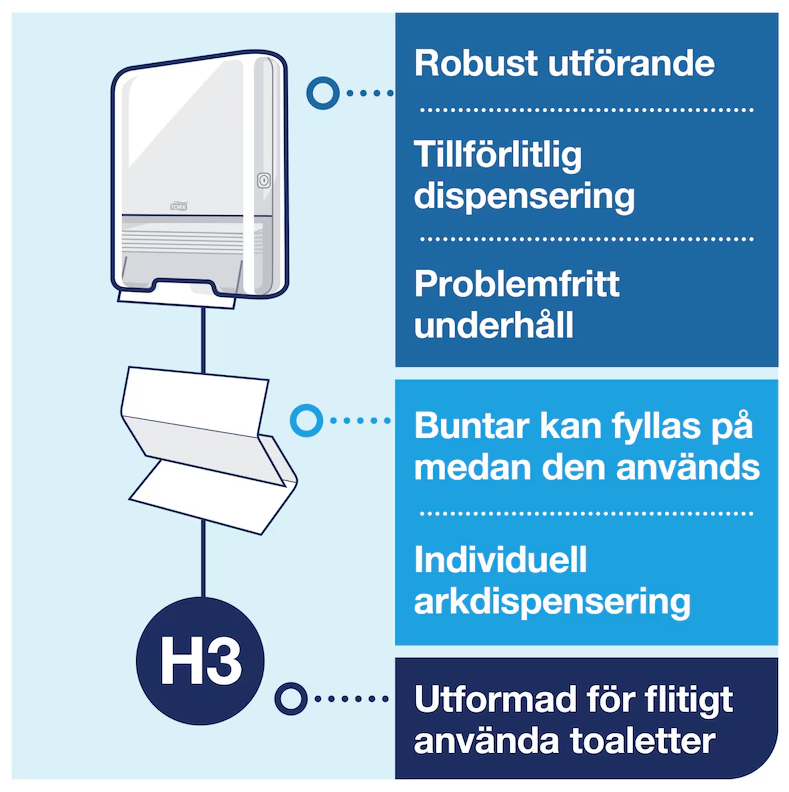Tork Dispenser Singlefold Handduk H3 i Elevation-design är lämplig för miljöer med låg till medelhög besöksfrekvens. Den tillförlitliga utmatningen av ett ark i taget minskar förbrukningen och därmed avfallet. Elevation-dispensrarna har en funktionell och modern design som lämnar ett bestående intryck på gästerna.