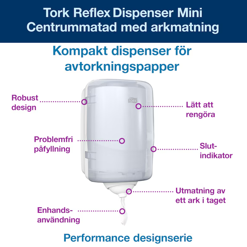Tork® Reflex® Dispenser Mini Centrummatad med arkmatning är perfekt för dem som söker en lösning för hand- och ytavtorkning. Med sin utrymmessparande design och roterande munstycke passar den för utrymmen av alla storlekar. Systemet matar ut ett ark i taget, vilket minskar förbrukningen med upp till 37 % jämfört med andra centrummatade dispensrar från Tork®.