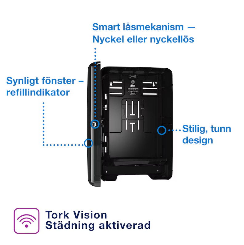 ● Aktiverad för Tork Vision Städning – möjliggör effektivare städning via realtidsinformation.