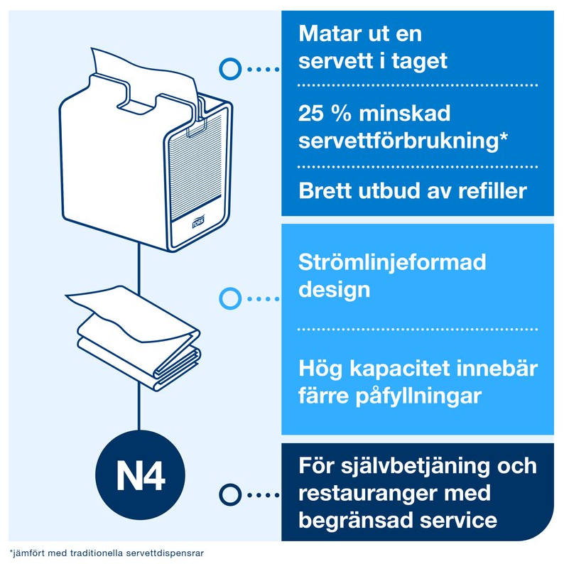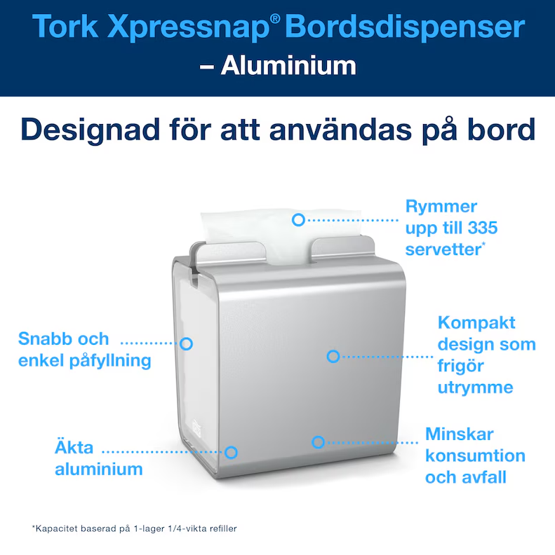 Tork Xpressnap® Bordsdispenser för servetter passar perfekt för restauranger med begränsad betjäning och fullbetjäning där man erbjuder servetter på en central plats. Den eleganta dispensern tillverkas av äkta material och matar ut en servett i taget. På så sätt förbättras hygienen och förbrukningen minskar med minst 25% jämfört med traditionella servettdispensrar.