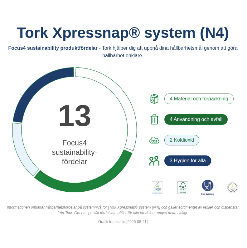 Xpressnap® har under sin totala livscykel (cradle-to-grave) ett genomsnittligt koldioxidavtryck på 3,5 g CO2-ekv. per användning, där de tre första stegen i livscykeln (cradle-to-gate) står för 2,2 g CO2-ekv. per användning. (Gäller endast för EU)*