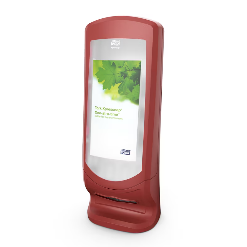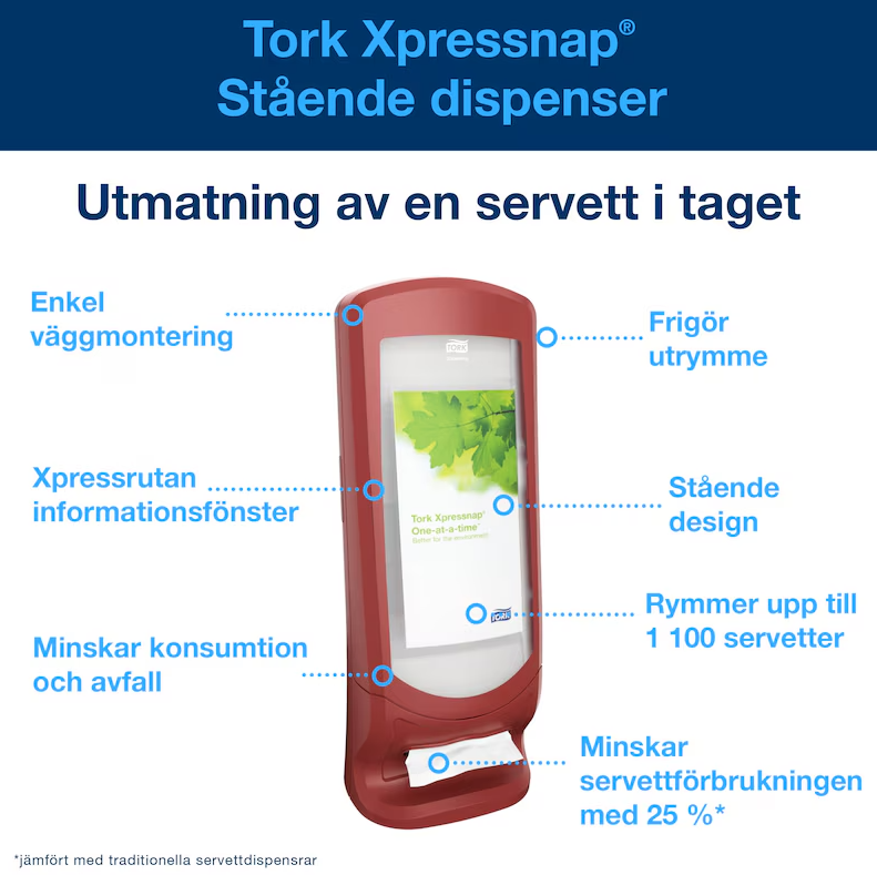 Tork Xpressnap® Stående Dispenser är perfekt för restauranger med hög trafik och begränsad betjäning. Den moderna designen matar ut en servett i taget, vilket förbättrar hygienen och minskar förbrukningen med minst 25 % jämfört med vanliga servettdispensrar.