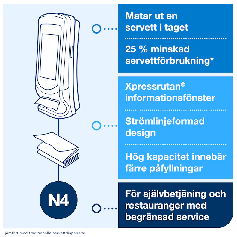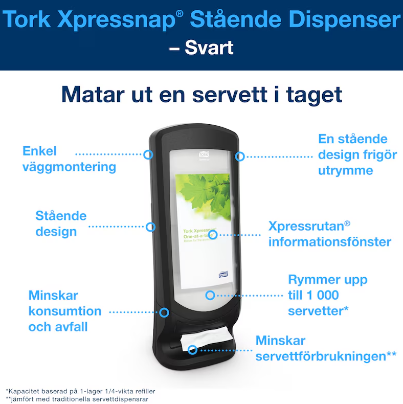 Tork Xpressnap® Stående Dispenser är perfekt för restauranger med hög trafik och begränsad betjäning. Den moderna designen matar ut en servett i taget, vilket förbättrar hygienen och minskar förbrukningen med minst 25 % jämfört med vanliga servettdispensrar.