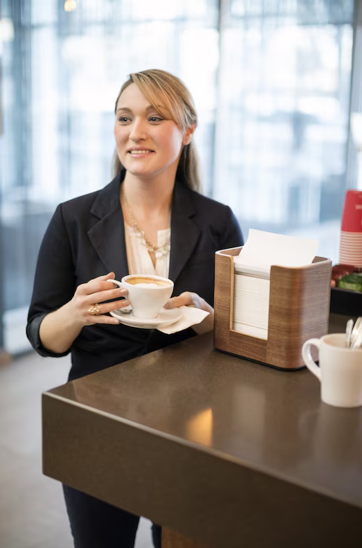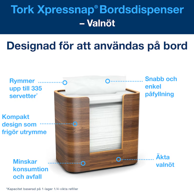 Tork Xpressnap® Bordsdispenser för servetter passar perfekt för restauranger med begränsad betjäning och fullbetjäning där servetter erbjuds på en central plats. Den eleganta dispensern, tillverkad av äkta valnötsträ, matar ut en servett i taget vilket förbättrar hygienen och minskar förbrukningen med minst 25 % jämfört med traditionella dispensrar.