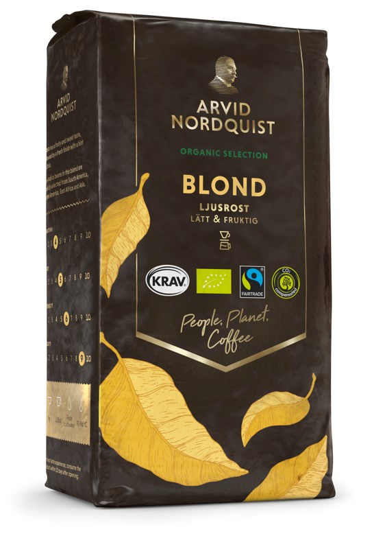 Arvid Nordquist Blond är ett ljusrostat kaffe med en fruktig och söt smak. Den har en frisk eftersmak med toner av citrus och en balanserad arom som gör den både lätt och uppfriskande. Kaffet ingår i Arvid Nordquists Selection-sortiment och består till 100% av ekologiska arabicabönor av hög kvalitet. Rostningen sker helt fossilfritt för att minimera klimatpåverkan och varje kopp är både hållbart och klimatkompenserat.