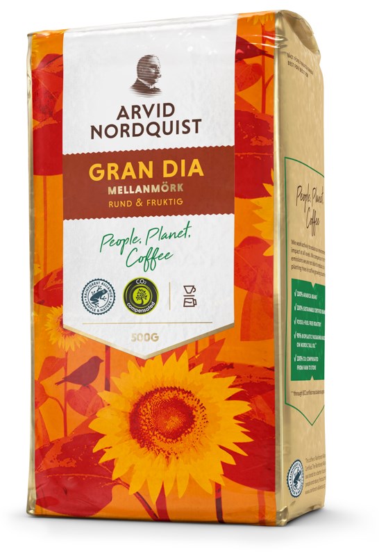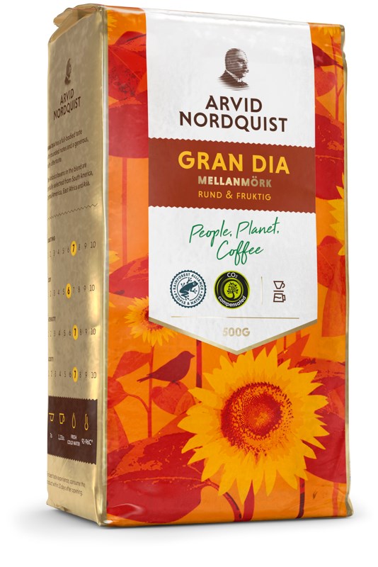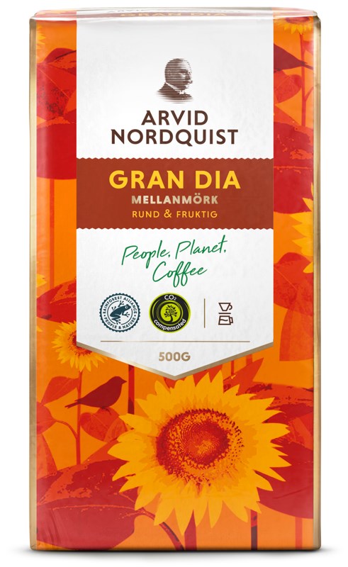 Arvid Nordquist Gran Dia är ett välbalanserat bryggkaffe med rund kropp och en generös, fruktig eftersmak. Den mellanmörka rostningen framhäver kaffets naturliga sötma och ger en behaglig balans mellan syrlighet och fyllighet. Gran Dia har en ren doft med inslag av knäck och hasselnöt, vilket ger en harmonisk smakupplevelse med toner av citrus och nypon. Kaffet består av 100% Arabicabönor av högsta kvalitet, rostas helt fossilfritt och är certifierat av Rainforest Alliance för hållbar odling och rättvisa arbetsförhållanden.