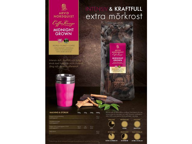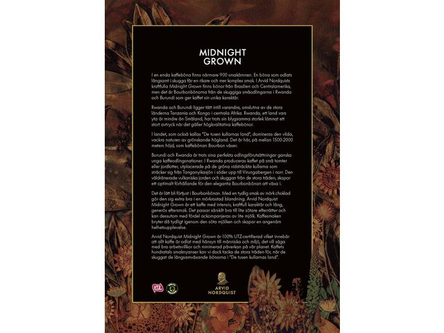 Arvid Nordquist Classic Midnight Grown erbjuder en smakrik och intensiv kaffeupplevelse med sin extra mörka rostning. Tillverkad huvudsakligen av brasilianska Arabicabönor bjuder den på en kraftig och kryddig arom balanserad av toner av mörk choklad. Smaken är fyllig och rund med en behaglig rökighet och låg syrlighet som ger en mjuk och len känsla. Ett perfekt val för kaffeälskare som uppskattar en stark, smakrik kopp med lång eftersmak. De hela bönorna mals för bästa smakupplevelse och kaffet är både UTZ-certifierat och klimatkompenserat för hållbar produktion.