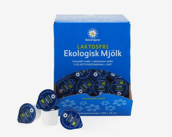 Produkten är ekologisk, laktosfri och innehåller 1,5% fett. Varje låda innehåller 100 portionsförpackningar, vilket gör den idealisk för arbetsplatser, caféer eller större evenemang.