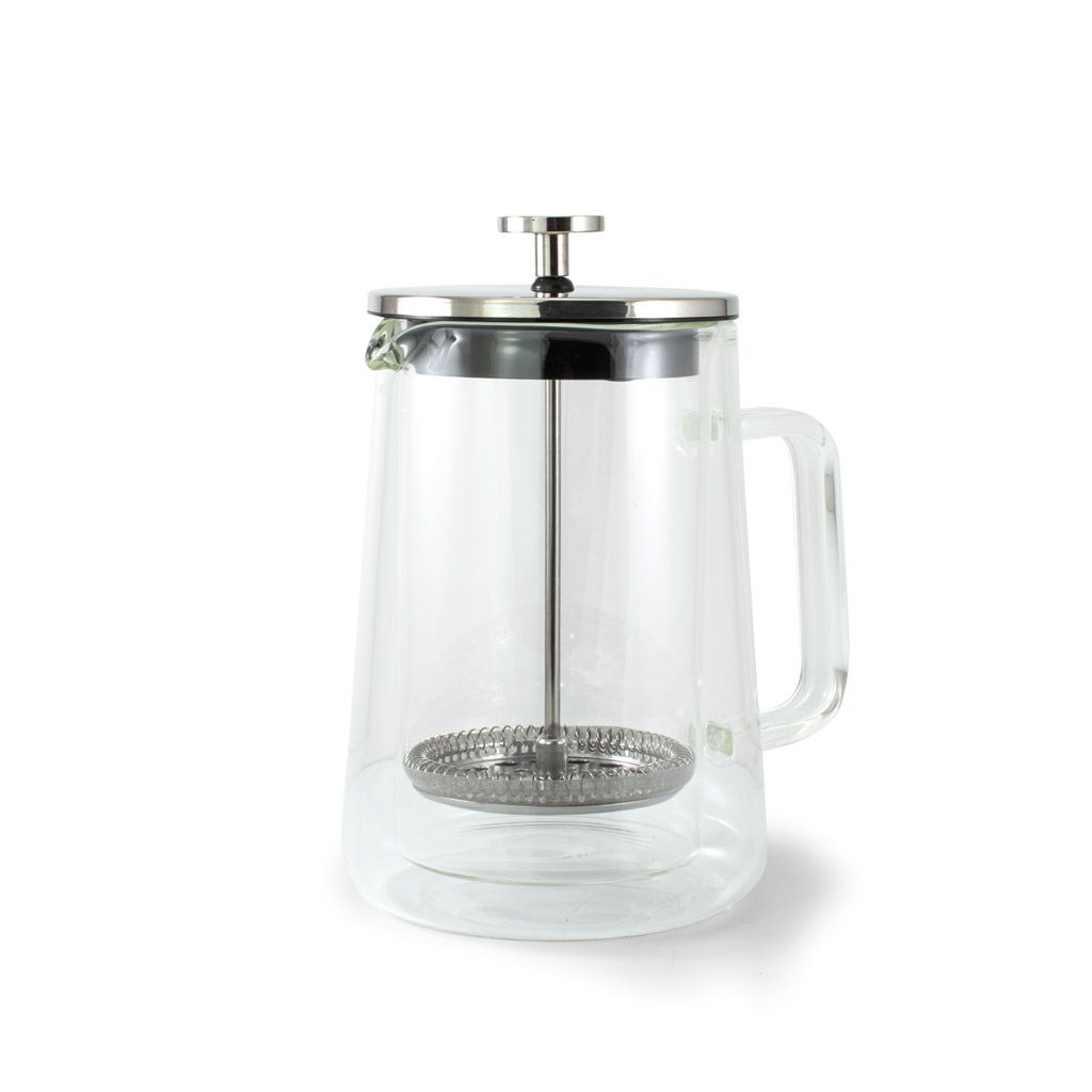Bistrokanna/fransk press i dubbelglas. 600 ml, vilket motsvarar 6 koppar. Bryggningsinstruktioner finns på förpackningen. Material: glas, rostfritt stål och EPE plast.