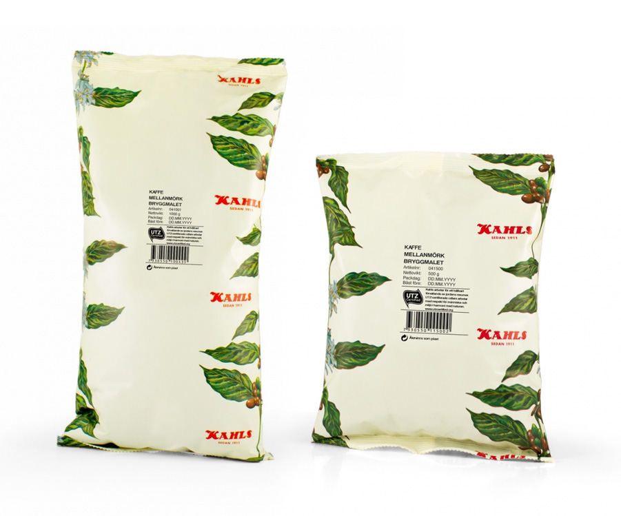 Kahls Mellanmörk Bryggmalet RFA SG är ett klassiskt kaffe som innehåller bönor från Östafrika, Brasilien och tvättat kaffe från Latinamerika. Kaffet är smakrikt, fylligt och har en behaglig syrlighet med en lång och god eftersmak.