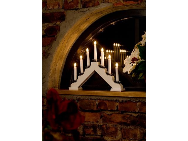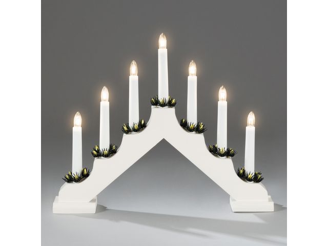 En kassisk 7-armad ljusstake i trä med varmvita lampor. Lackad i vitt. Anslutningssladd på 1,7 meter. Strömbrytare för manuell avstängning/påslagning. Höjd 30 cm och bredd 38 cm.