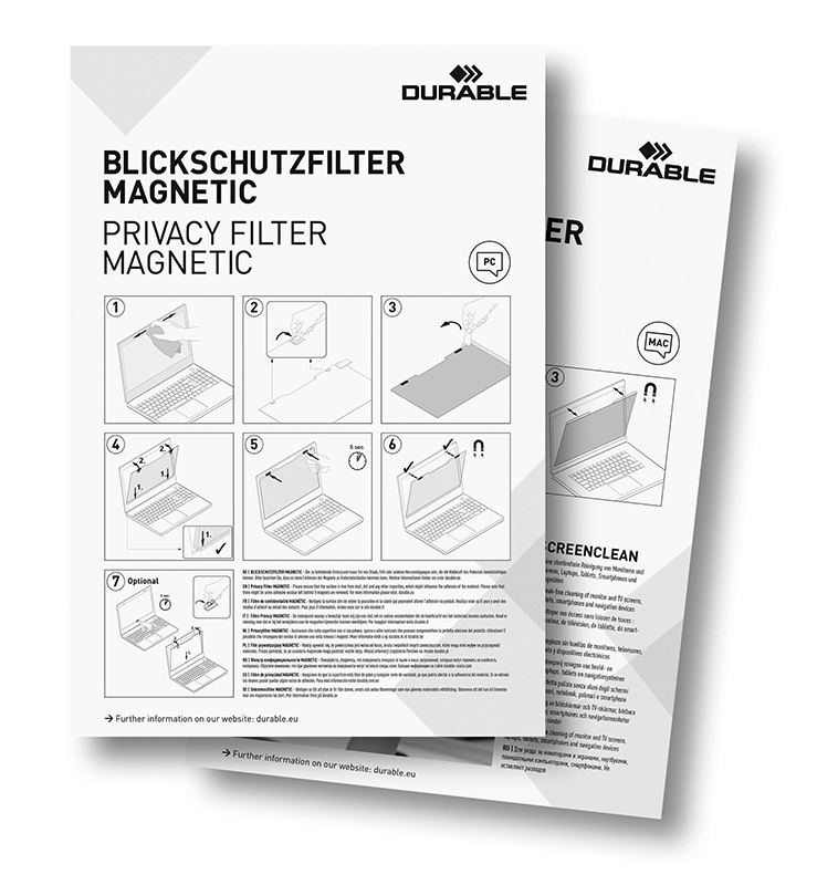 Två magneter gör det lätt att sätta dit och ta bort ditt sekretessfilter som när det inte används kan förvaras i den medföljande förvaringsfickan. Sekretessfiltret gör att skärmen blir mörk från båda sidor i 30° vinkel, men ger användaren en tydlig skärmbild framifrån.