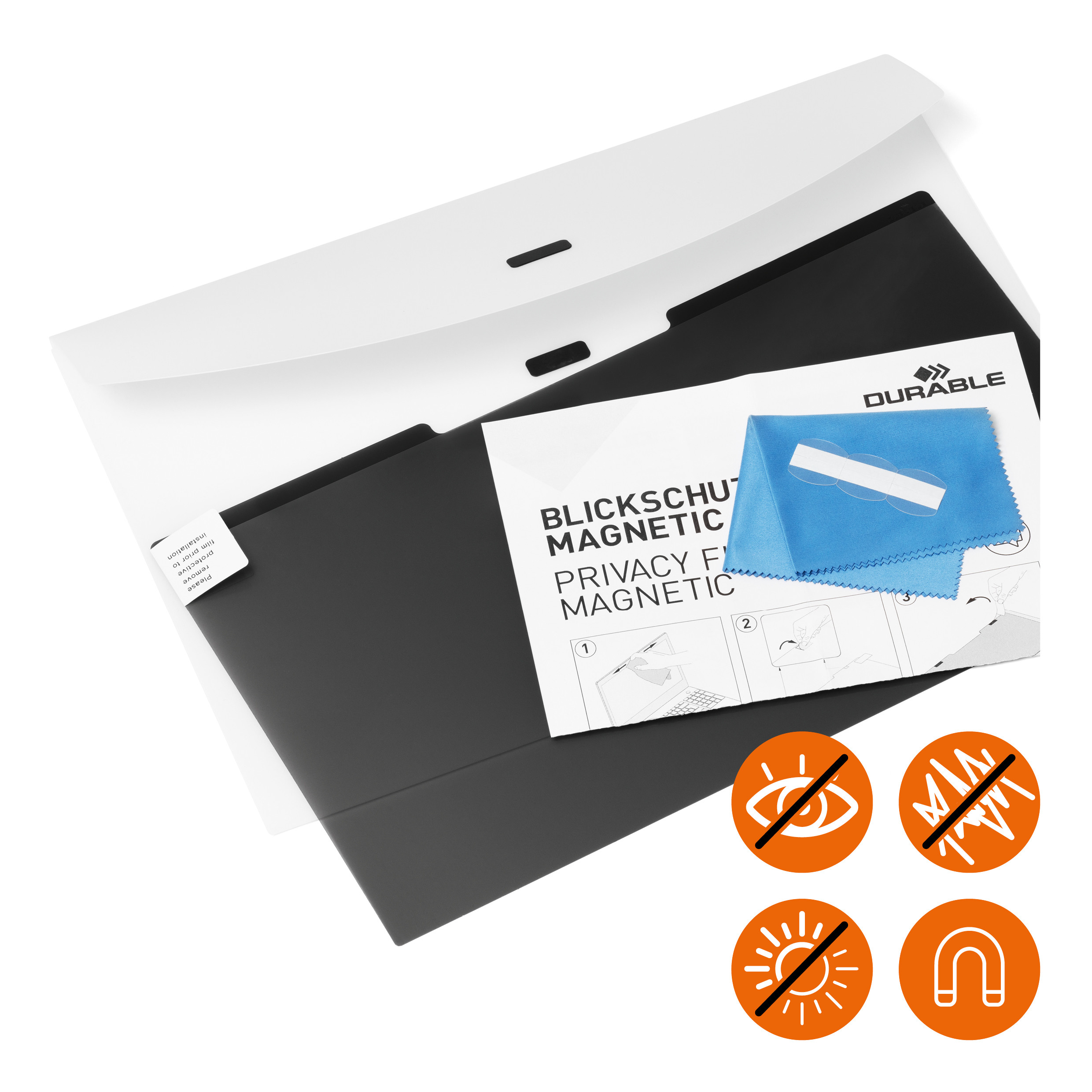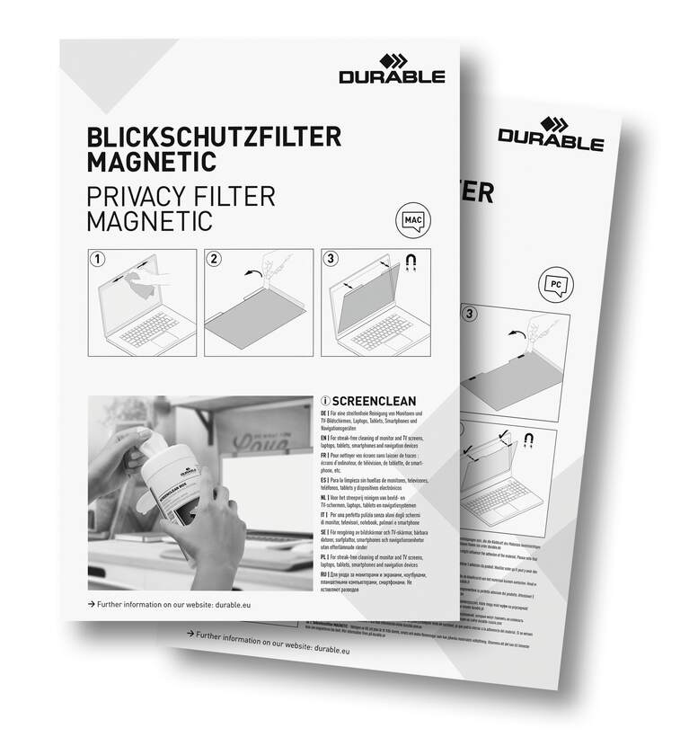 Sekretessfiltret fästs direkt på kanten av bildskärmen med integrerade metallremsor, vilket ger en stabil och diskret montering utan att påverka skärmens funktion. Den matta ytan reducerar reflektioner och minskar blått ljus, vilket bidrar till ökad ögonkomfort vid längre arbetspass. Filtret skyddar även bildskärmen mot repor och damm och kan användas tillsammans med pekskärmar. Levereras med skyddsfodral för säker förvaring samt mikrofiberduk för rengöring.