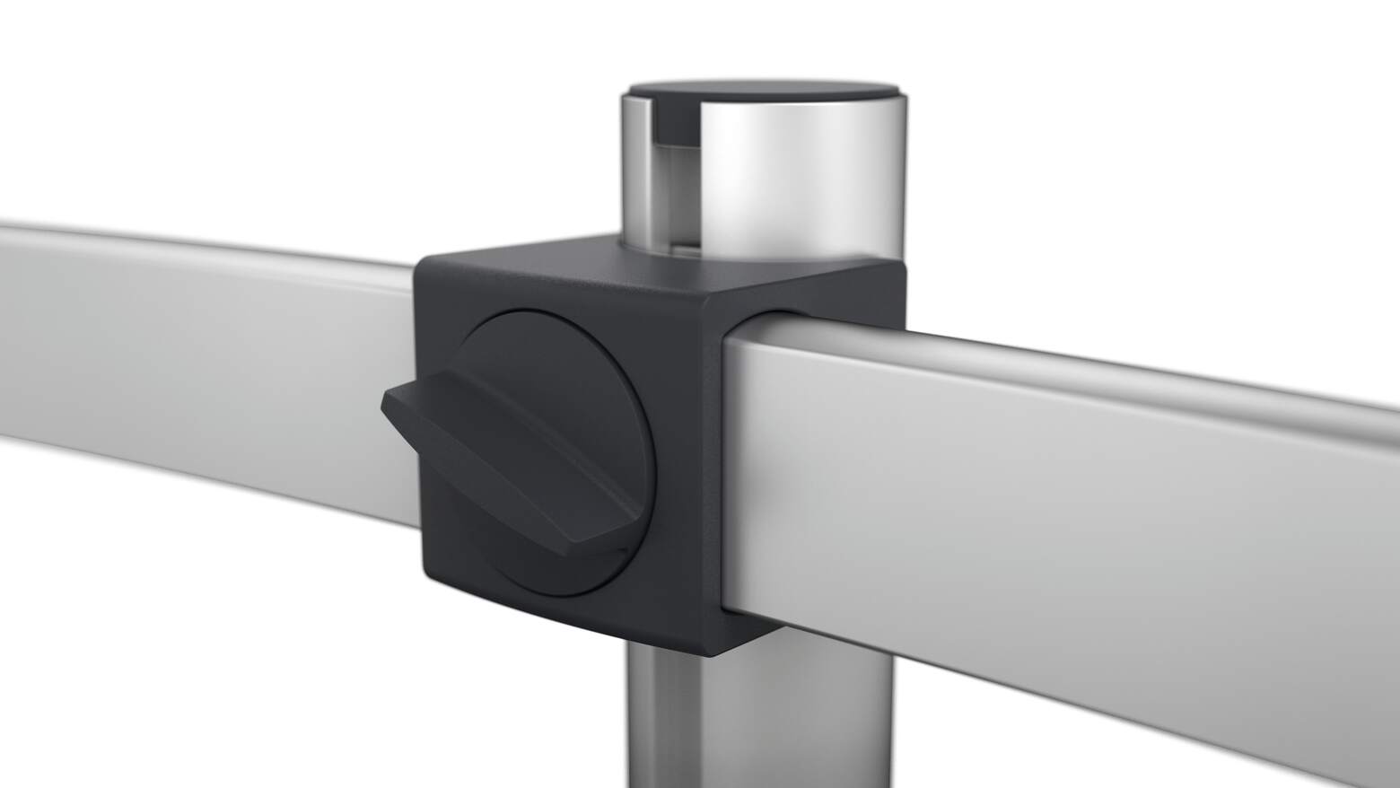 Surfplattefästet kan låsas med specialnyckel för att förhindra obehörig borttagning, vilket gör produkten särskilt lämplig för kontor, receptioner och offentliga miljöer. Ett inbyggt skyddssystem minskar risken för personskador från rörliga komponenter. Kabelhanteringen hålls prydlig och säker med fem medföljande kabelklämmor som kan fästas separat. Bildskärmen kan dessutom flyttas och fixeras fritt längs den tvärgående armen. Kabelhålsfästet ger en stabil och platsbesparande montering genom bordsskivan.