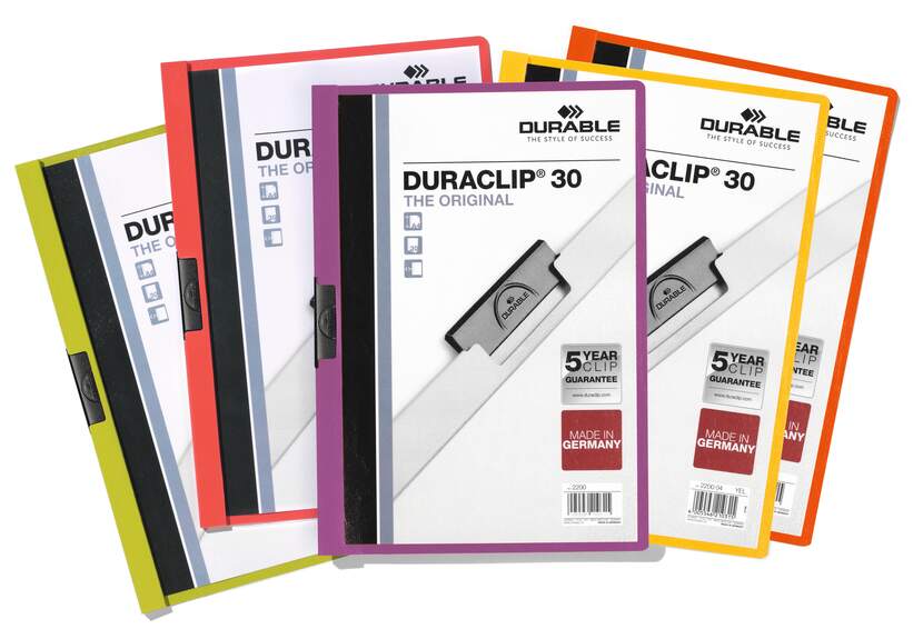 Klämmapp från Durable i serien Duraclip, tillverkad av slitstark plast och utformad för säker och praktisk förvaring av A4-dokument. Den starka klämman av specialstål håller upp till 30 ark stadigt på plats utan behov av hålslagning, vilket gör den idealisk för offerter, möteshandlingar och utbildningsmaterial.