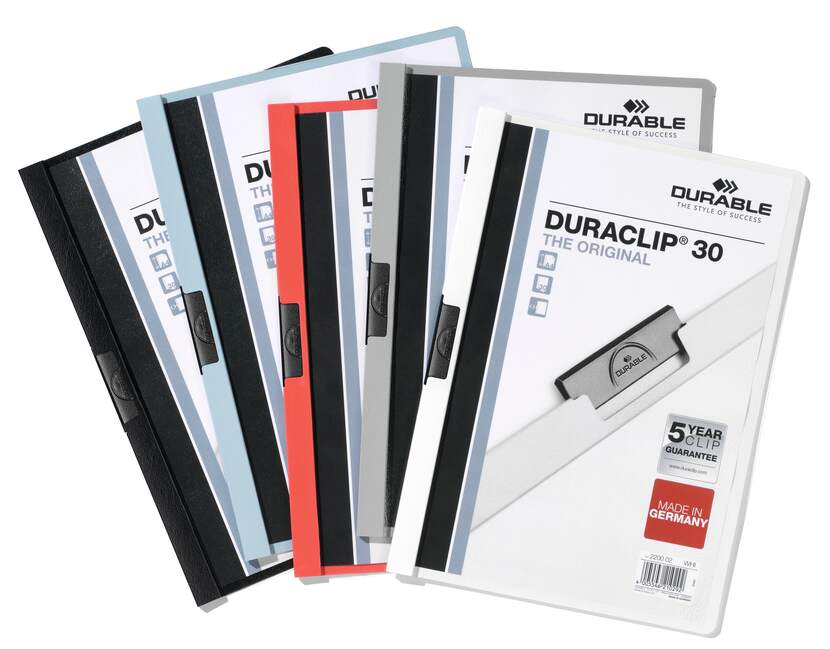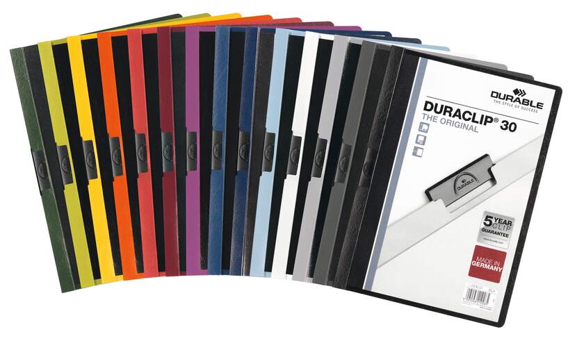 Klämmapp från Durable i serien Duraclip, tillverkad av slitstark plast och utformad för säker och praktisk förvaring av A4-dokument. Den starka klämman av specialstål håller upp till 30 ark stadigt på plats utan behov av hålslagning, vilket gör den idealisk för offerter, möteshandlingar och utbildningsmaterial.