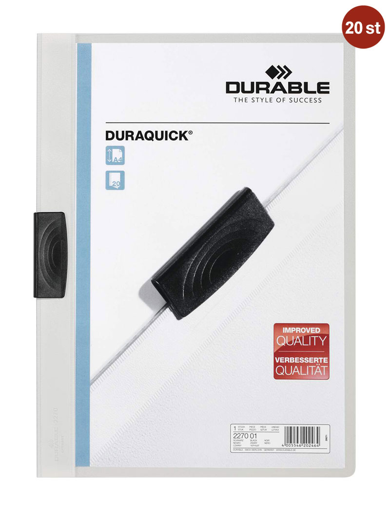 Klämmapp från Durable i serien Duraquick 20, tillverkad av polypropen och utrustad med en platt och permanent elastisk plastklämma som håller dokumenten säkert på plats. Den rymmer upp till 20 ark och kräver ingen hålslagning, vilket gör den idealisk för offerter, möteshandlingar och utbildningsmaterial i A4-format.
