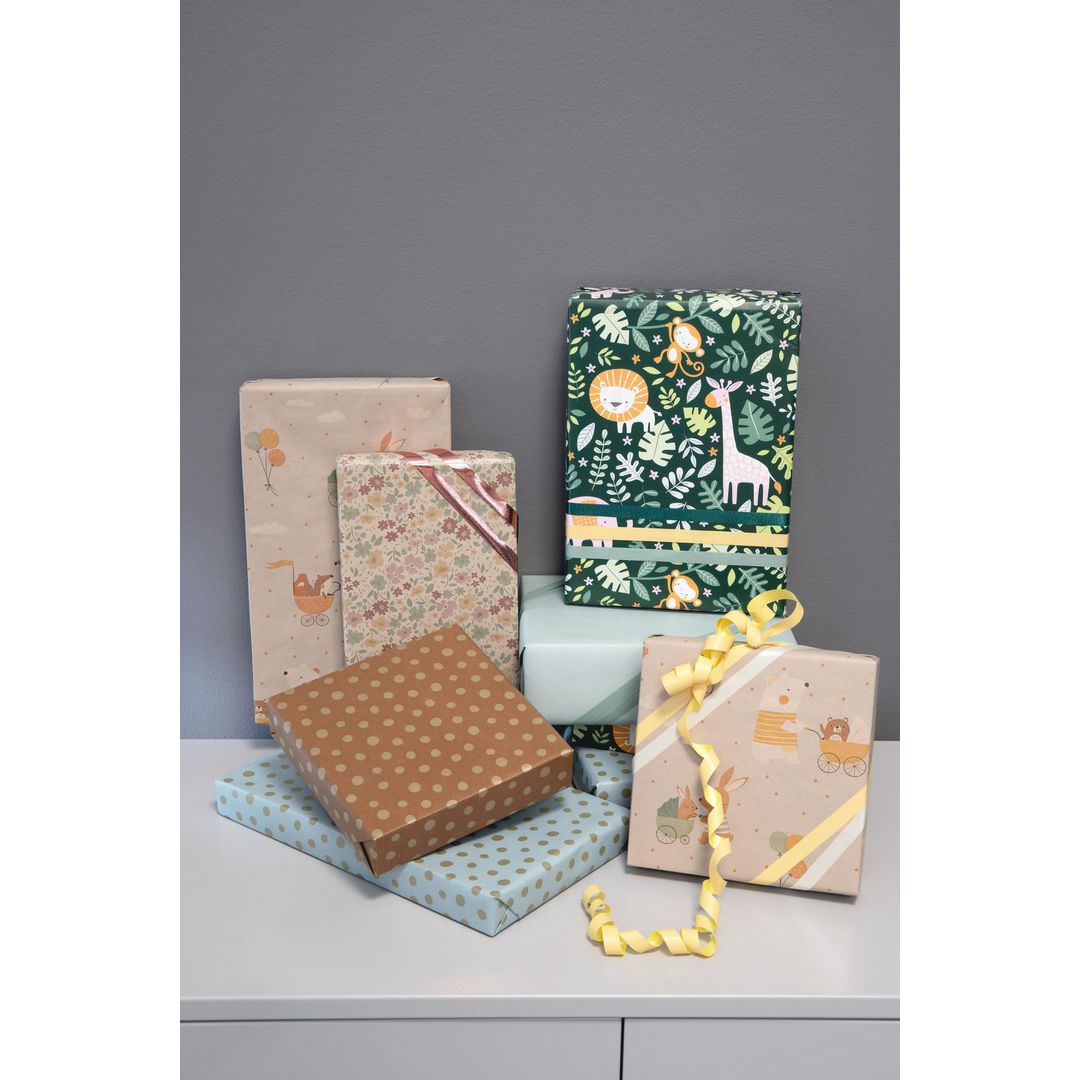 Vackert blommigt presentpapper tillverkat i Sverige av FSC-märkt kraftpapper.