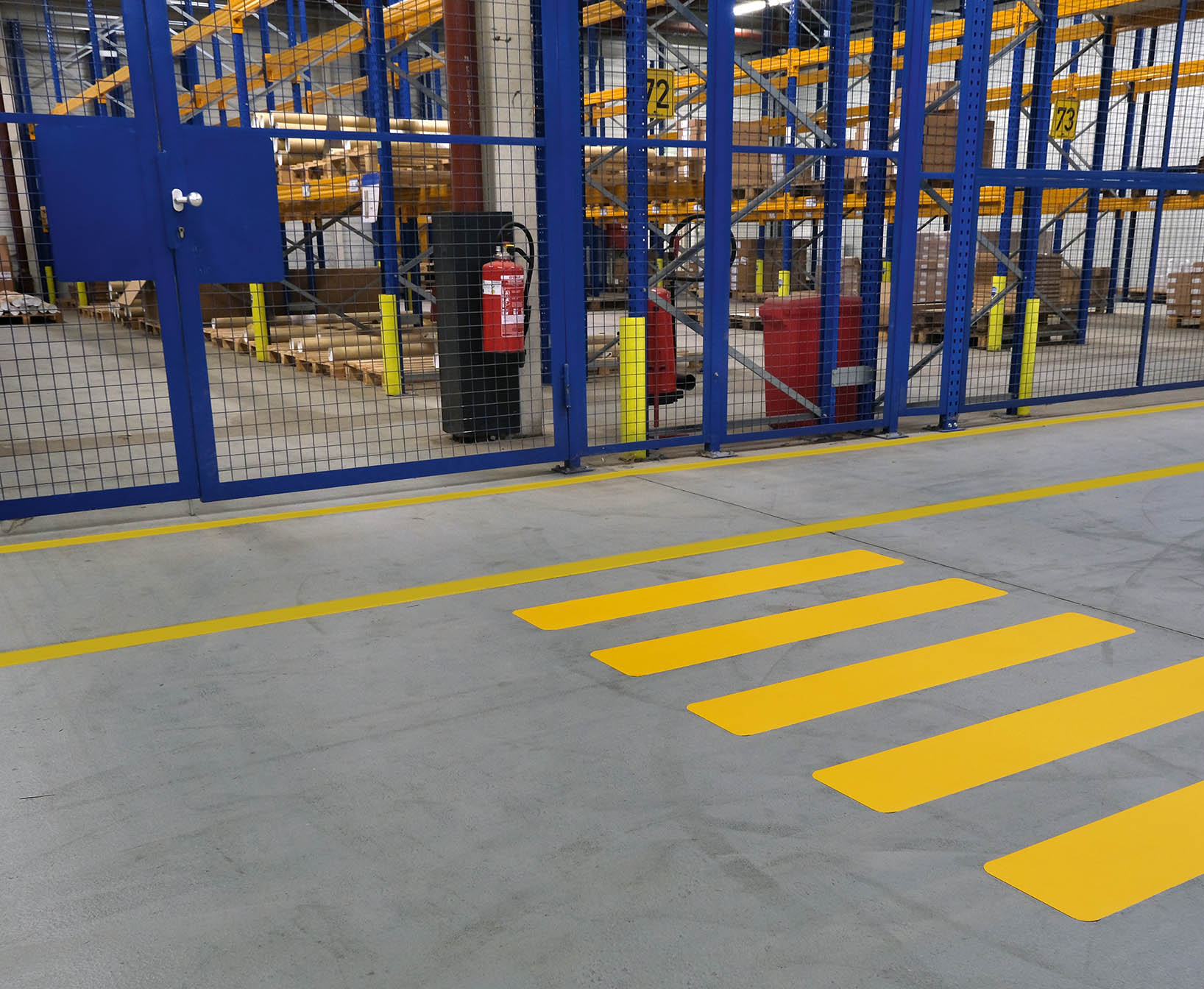 Säkerheten på lagret är en avgörande faktor för att skydda medarbetare och optimera arbetsprocesser. Med en allt mer komplex logistikbransch ökar behovet av tydlig markering av trafikzoner. DURABLE introducerar därför permanent självhäftande övergångsställe, i ett set om fem streck. Ger ökad säkerhet för fotgängare i lager- och produktionslokaler med korsande transportvägar. Avsedd för inomhusbruk och fäster på rena och torra betonggolv. Slitstarka och tåliga med halkskyddsgrad R9 i enlighet med DIN 51130. Lämplig för gaffeltruckar, med undantag för styr-, broms- och svängrörelser.