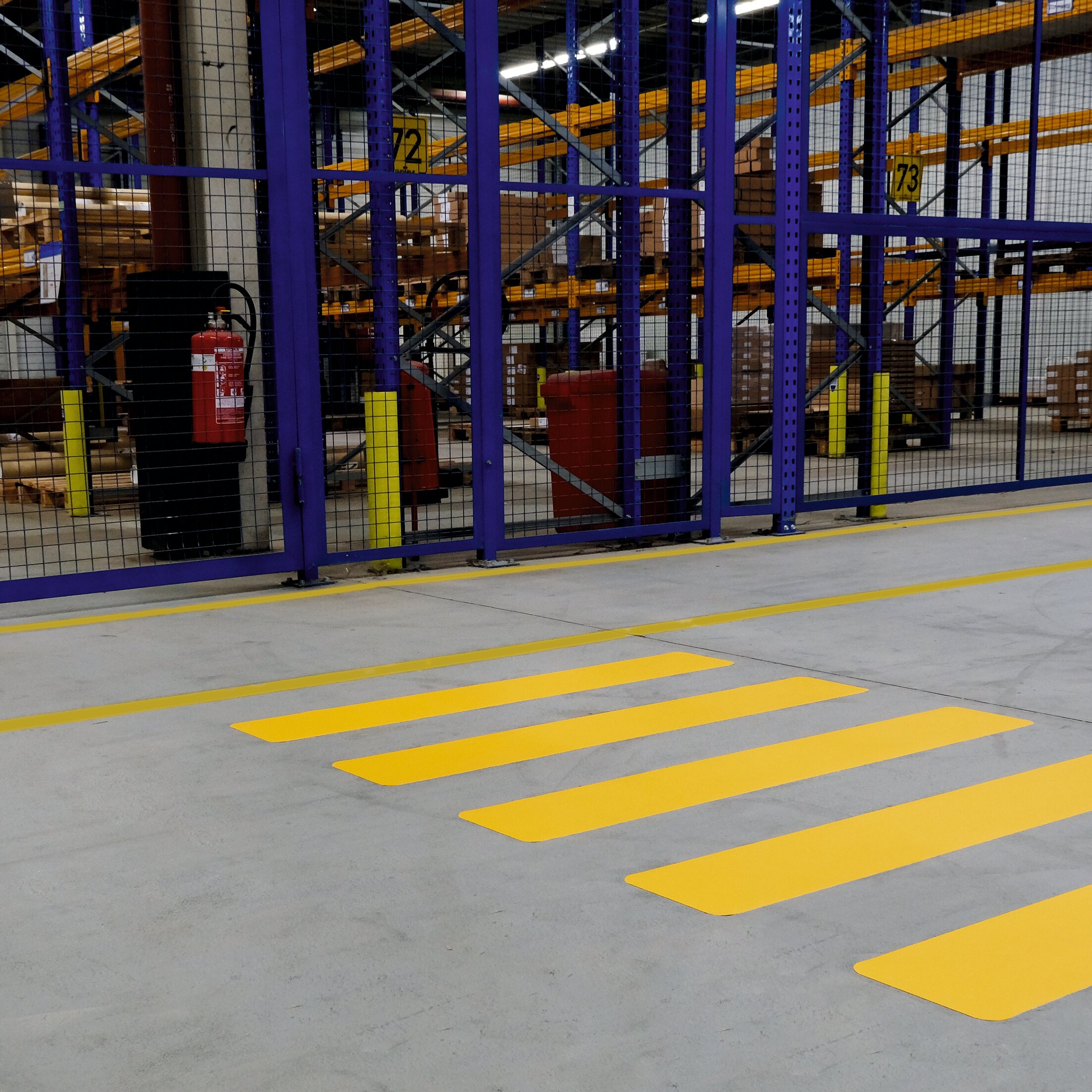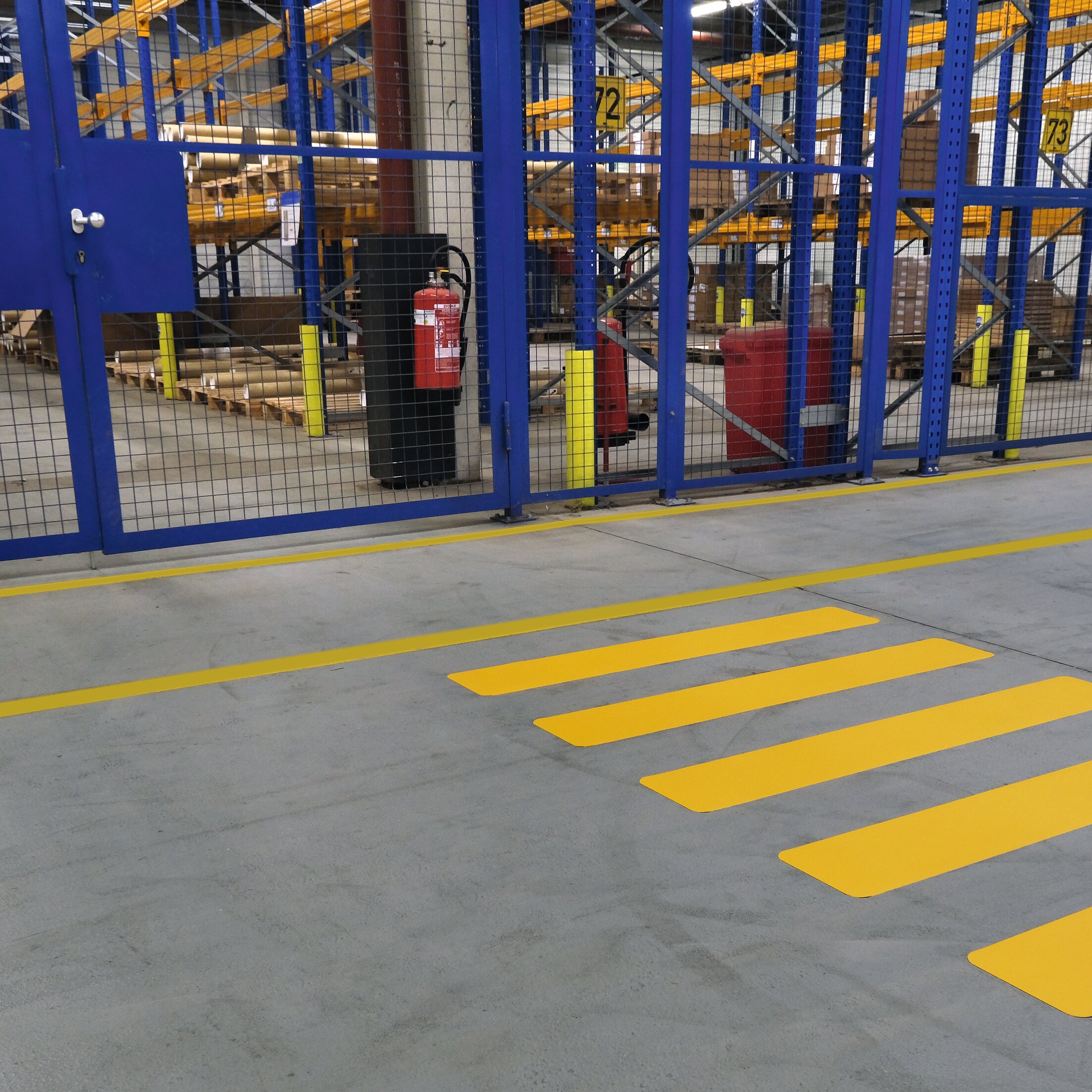 Säkerheten på lagret är en avgörande faktor för att skydda medarbetare och optimera arbetsprocesser. Med en allt mer komplex logistikbransch ökar behovet av tydlig markering av trafikzoner. DURABLE introducerar därför permanent självhäftande övergångsställe. Ger ökad säkerhet för fotgängare i lager- och produktionslokaler med korsande transportvägar. Avsedd för inomhusbruk och fäster på rena och torra betonggolv. Slitstarka och tåliga med halkskyddsgrad R9 i enlighet med DIN 51130. Lämplig för gaffeltruckar, med undantag för styr-, broms- och svängrörelser. Detta extra streck är perfekt om övergångsstället behöver göras lite bredare, eller om något streck behöver bytas ut.