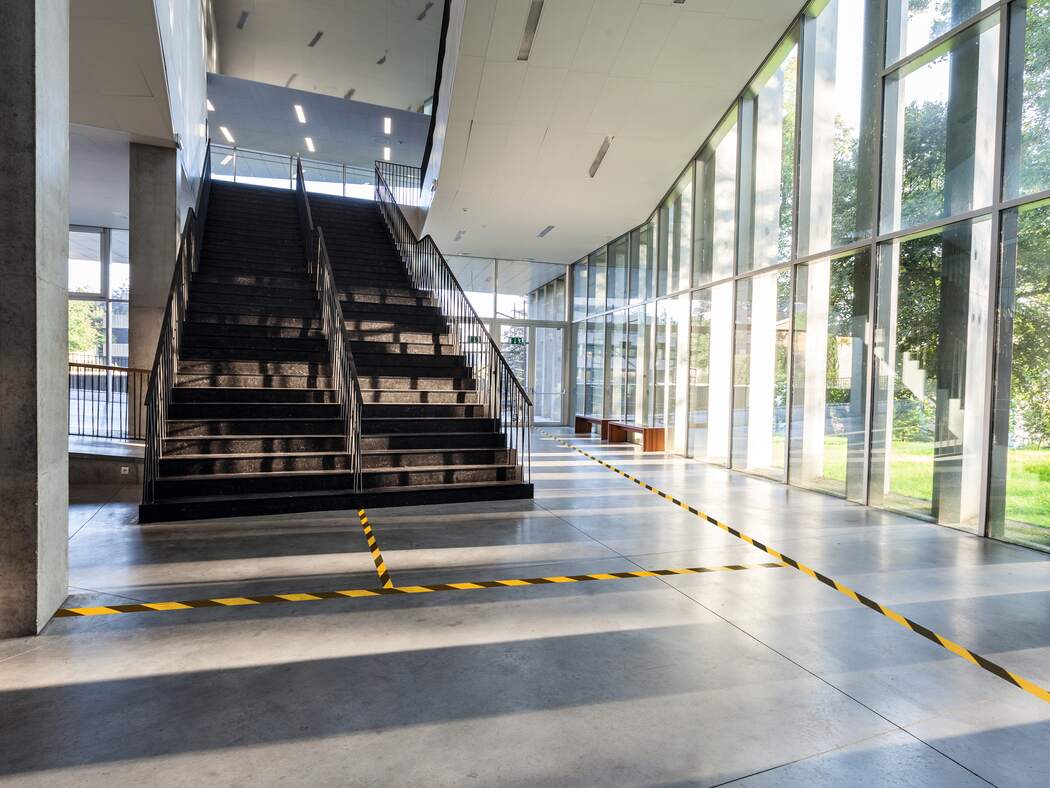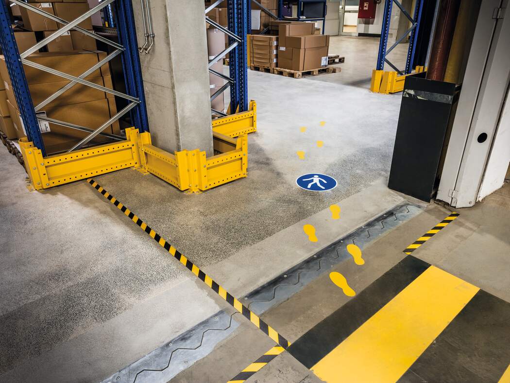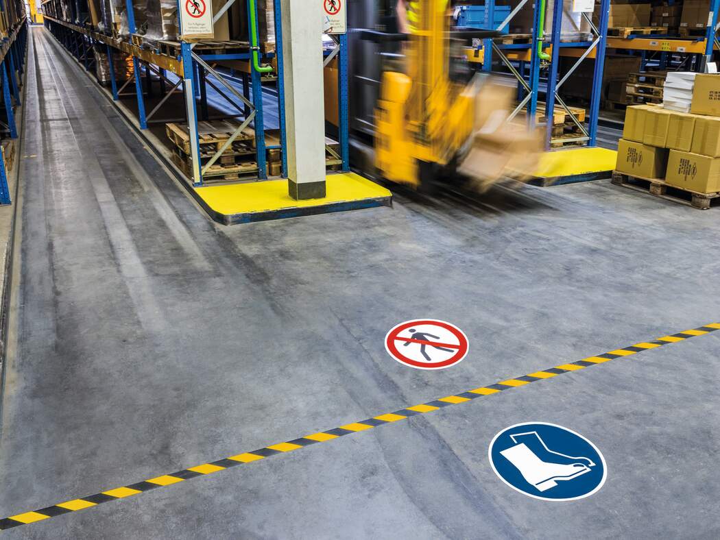 Självhäftande randig golvmarkeringstejp i varselfärger. Ökar säkerheten genom tydlig märkning av riskområden inom lager och industri.