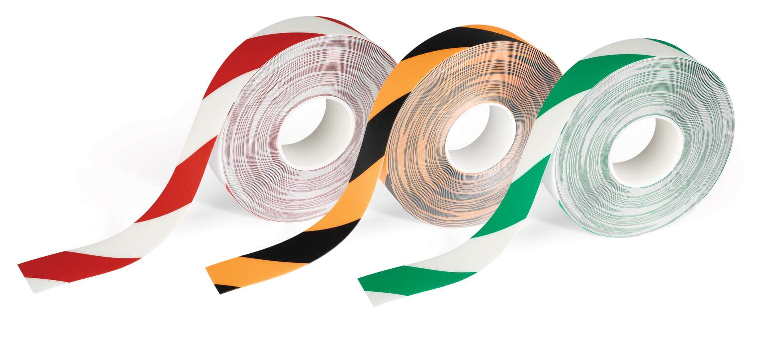 Självhäftande randig golvmarkeringstejp i varselfärger. Ökar säkerheten genom tydlig märkning av riskområden inom lager och industri.