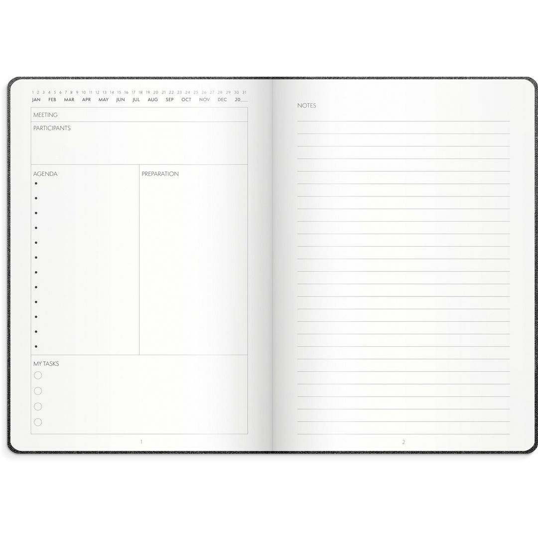 Anteckningsbok framtagen för möten. Skriv ner agendan och vad som behöver förberedas. 3st anteckningssidor finns för varje möte. Plats för 44 möten.