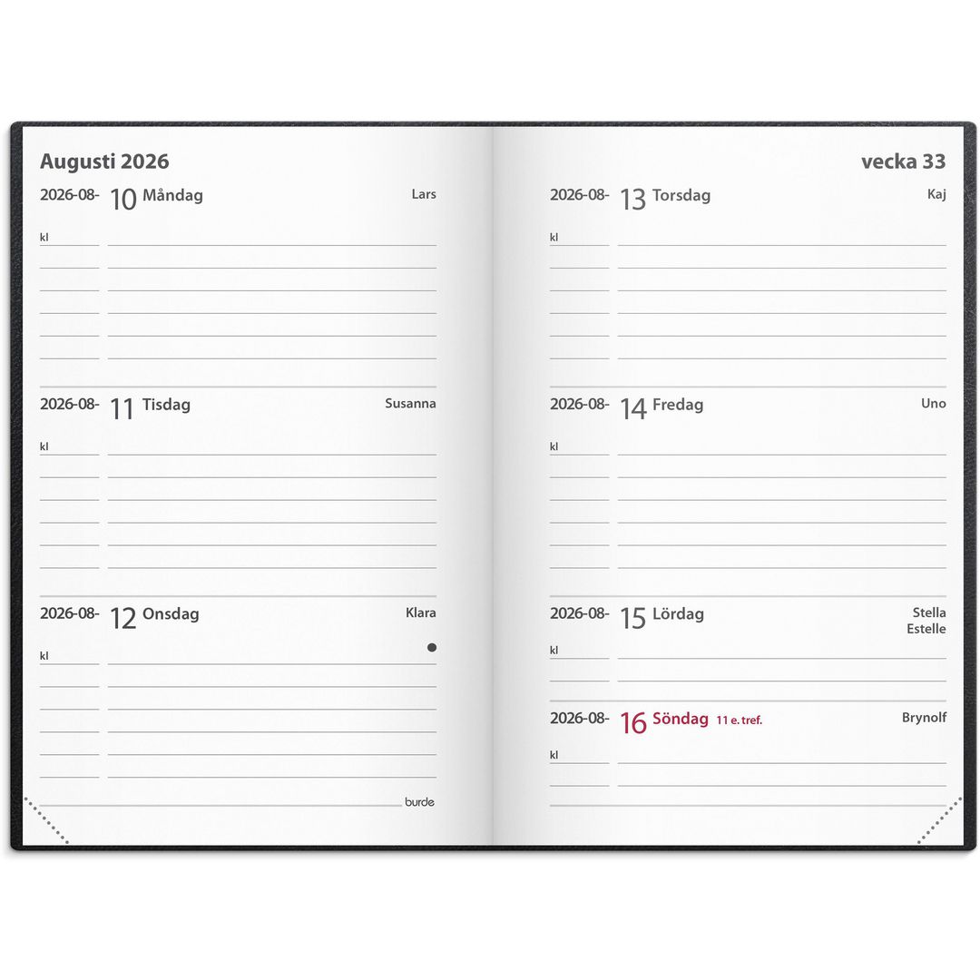 Kalender med en vecka per uppslag. Årsplaner för innevarande och följande år. Telefonregister och atlas.