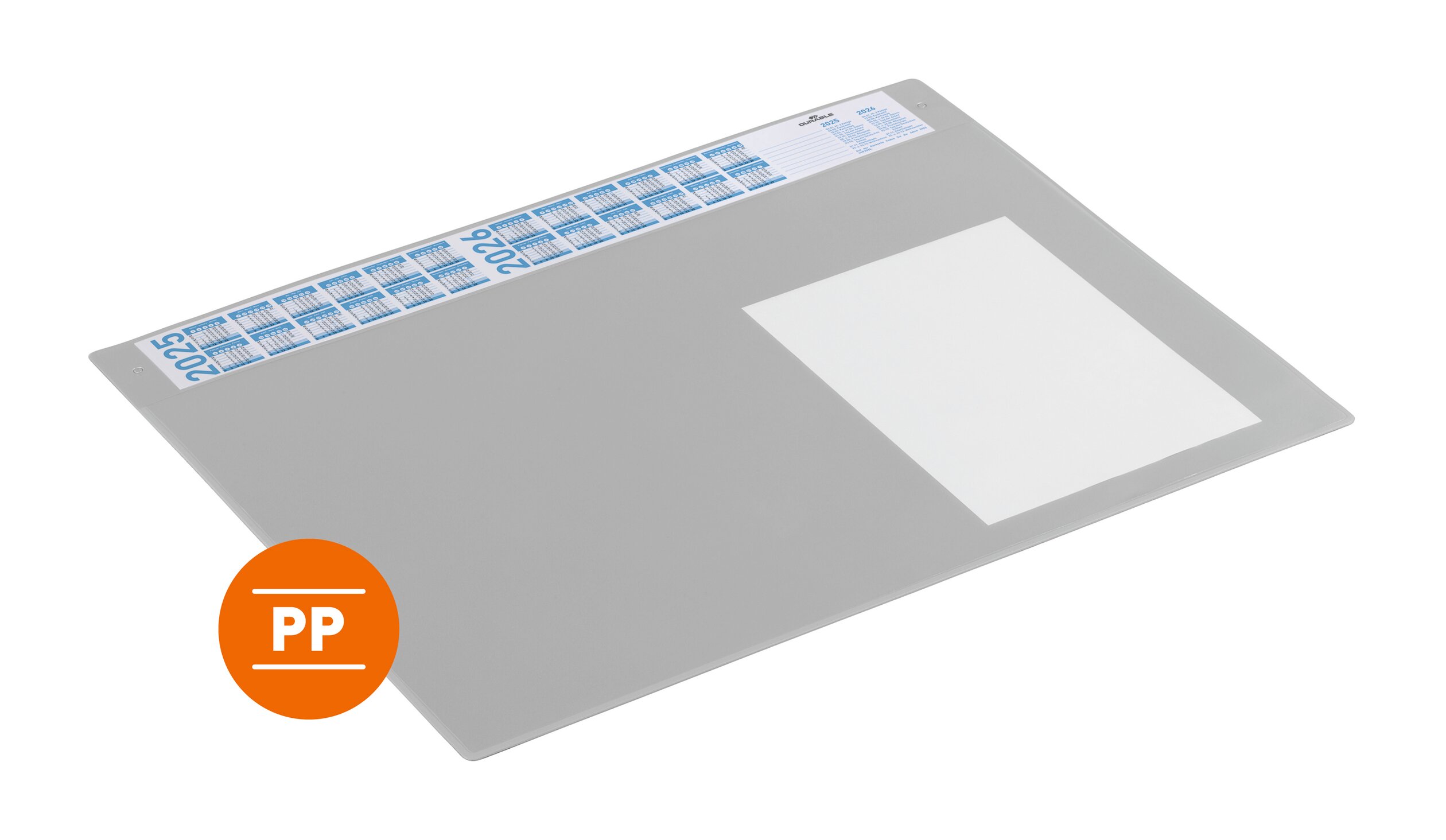 Använd skrivbordsunderlägg för att skydda bordet mot slitage. Detta underlägg har transparent, reflexfri och borttagbar klaff som det går att förvara noteringar, anteckningar och lappar under. Dessutom en smal översiktskalender för 4 år. Tack vare en tillverkningsmetod som gör att undersidans yta får bra grepp, ligger underlägget stadigt på bordet utan att glida. Kan torkas av med en fuktig trasa på båda sidorna. Tillverkad av polyproylen och 100% återvinningsbar.