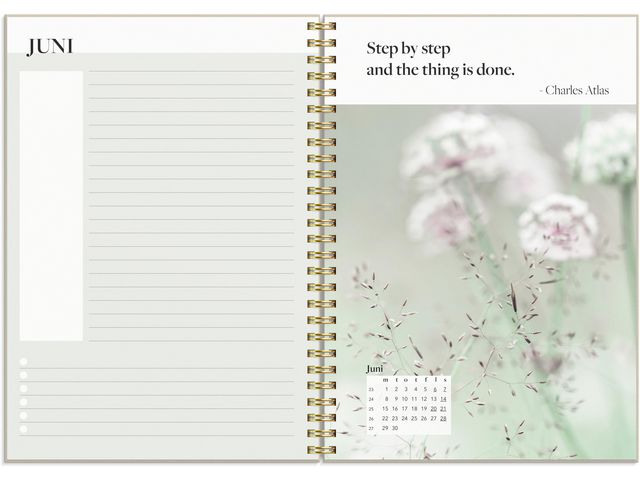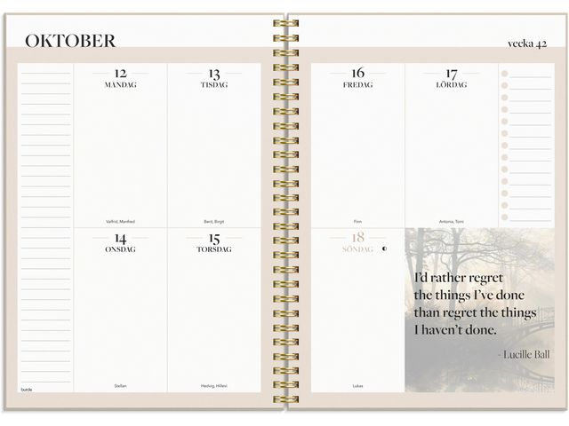 En inspirerande A5 veckokalender som genom citat påminner dig varje vecka om det värdefulla i dig och din tillvaro. Gott om utrymme för veckans planering och reflektioner. Du kommer bära med dig en skön känsla tack vare vackra bilder och milda färger. Stående layout med en ruta per vecka som du antingen kan skriva eller beskriva dina planer via dina egna små illustrationer.