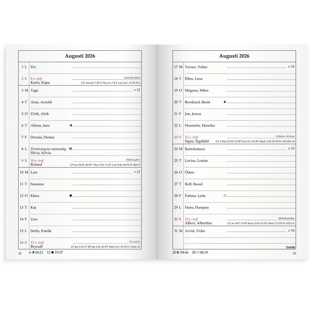 Kalender där du kan följa solens och månens upp- och nedgång varje dag vid sex olika horisonter. Den innehåller fakta om planeterna på himlen för varje månad och blandade uppgifter om Sverige.