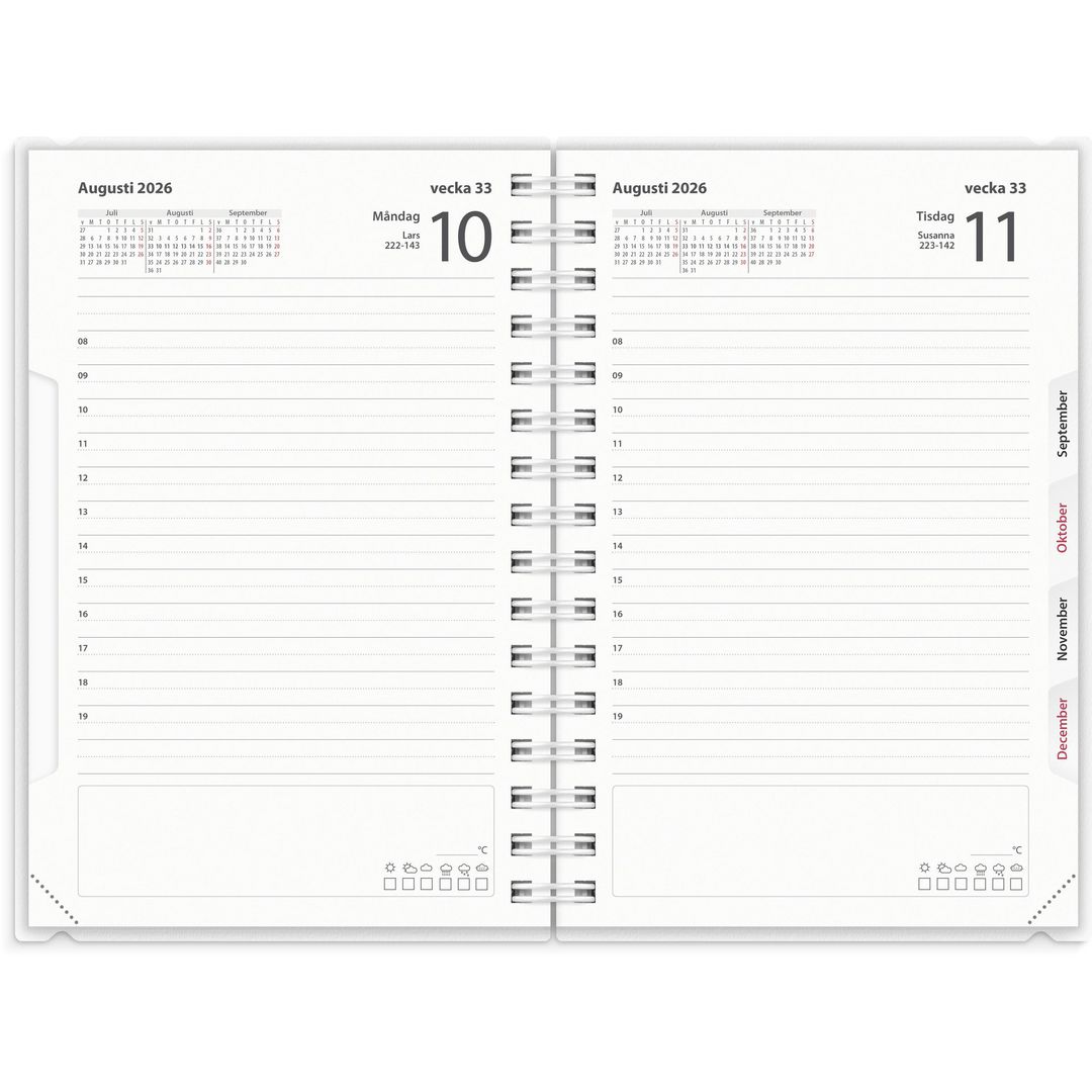 ● Layout: Dag/sida. Timindelning 8-19