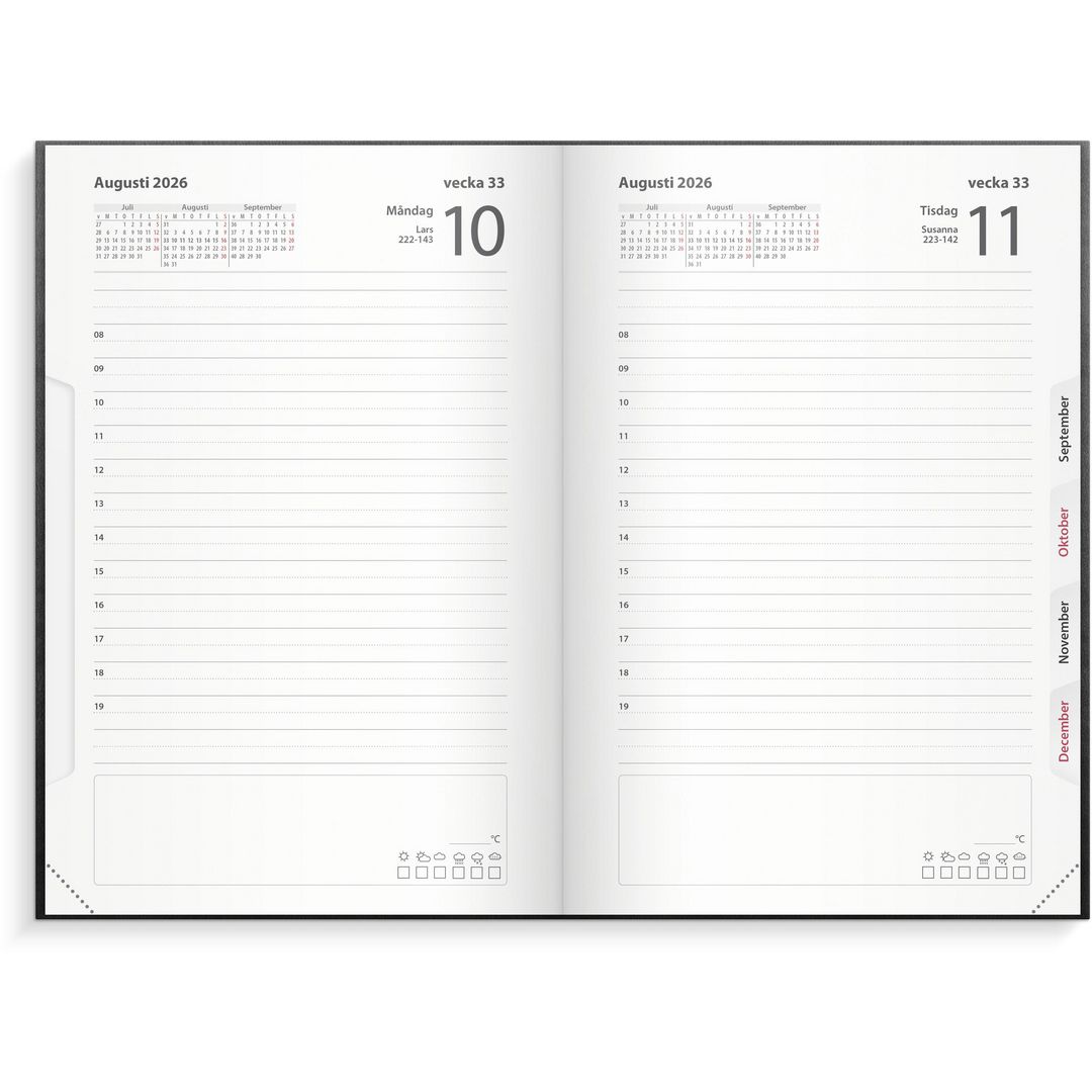 En dag per sida, timindelad 8-19. Årsplaner för innevarande och följande år. Urstansat månadsregister.
