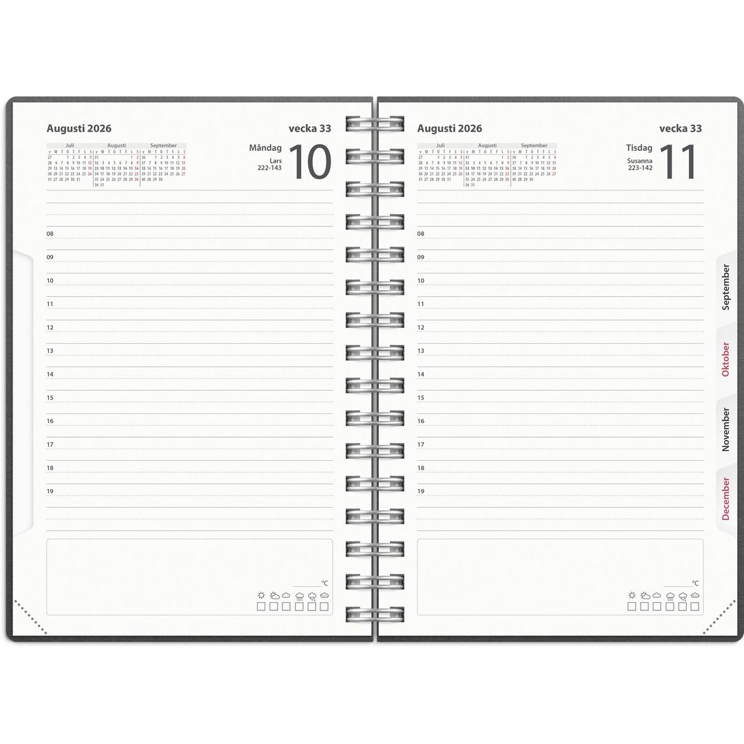 En dag per sida, timindelad 8-19. Årsplaner för innevarande och följande år. Urstansat månadsregister.